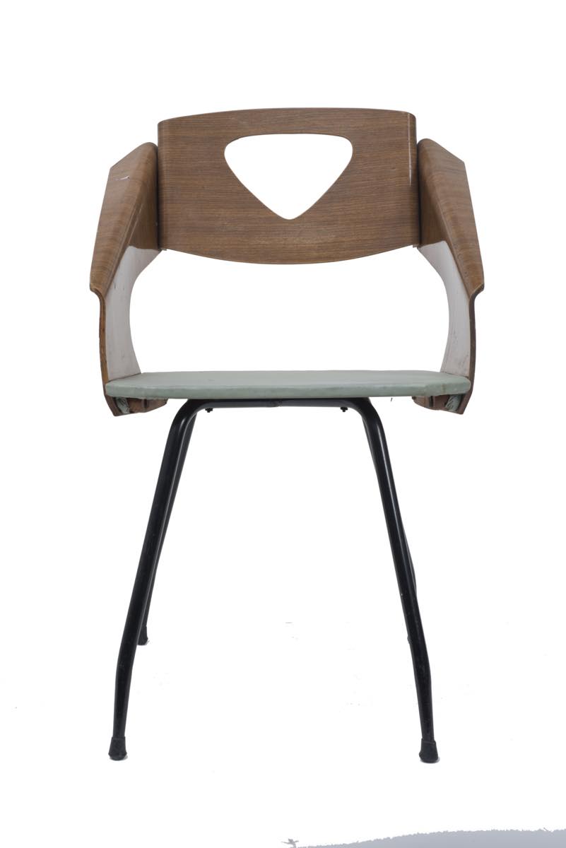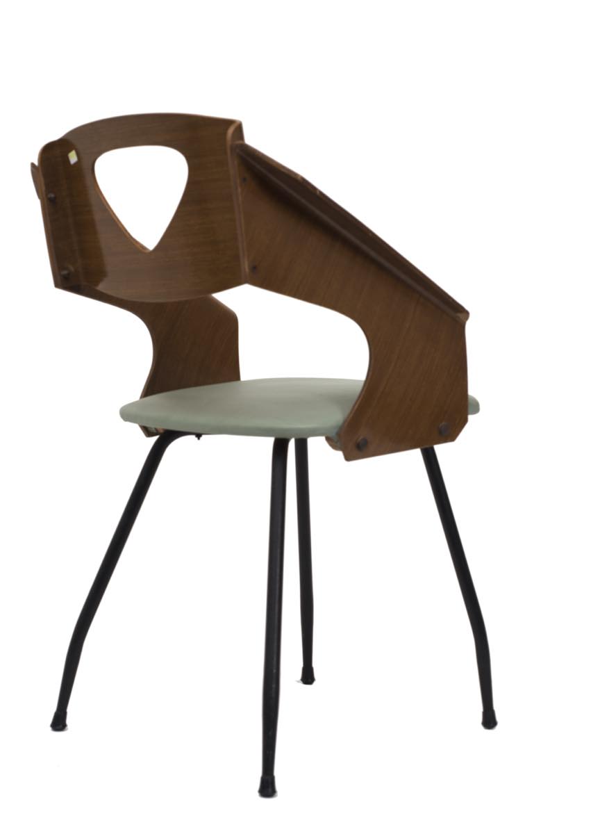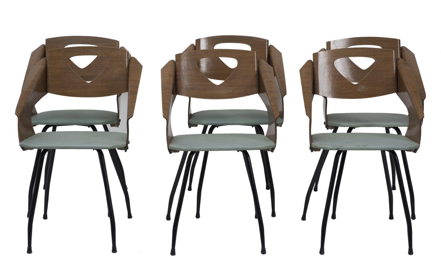 Set di sedie in compensato di teak curvato, struttura in metallo.