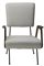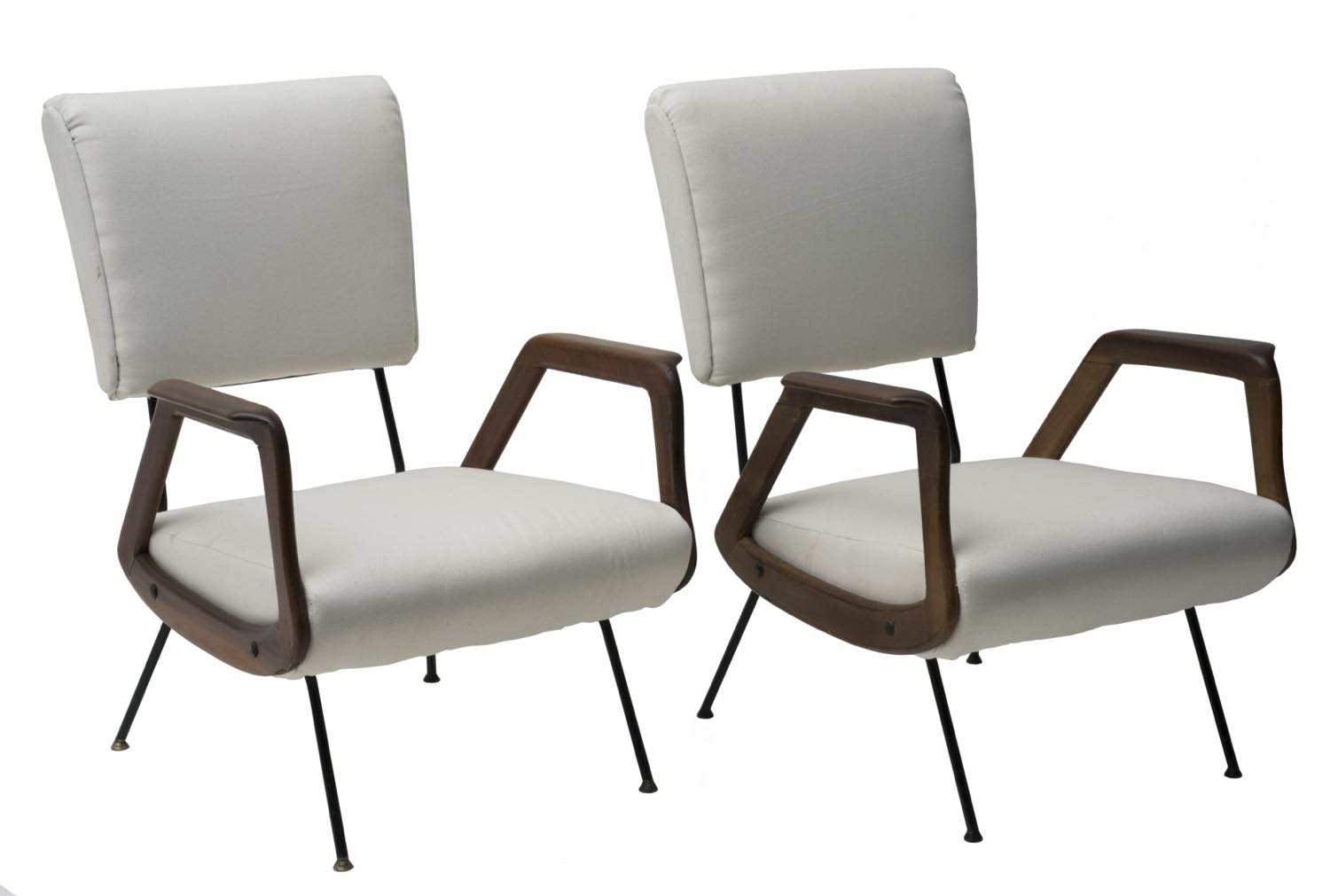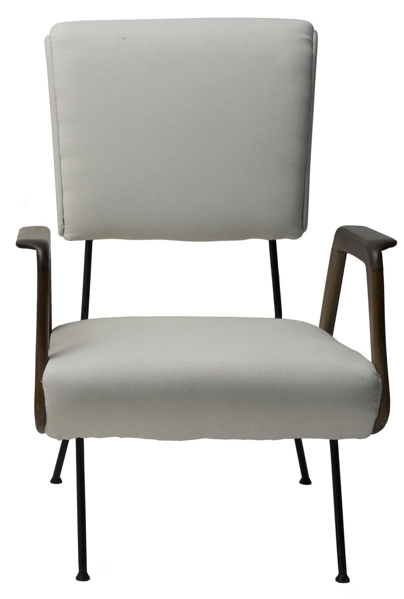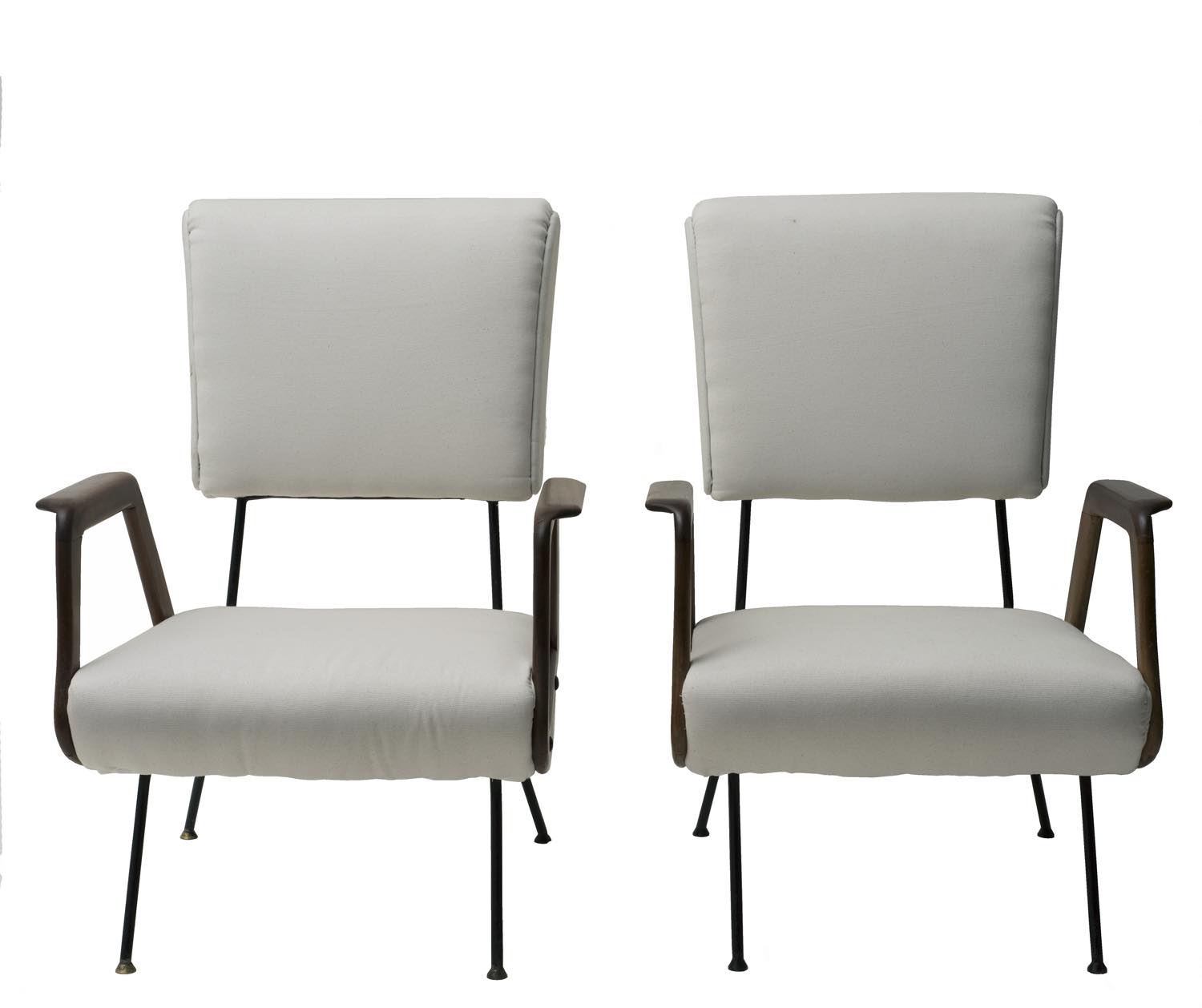Coppia di poltrone con struttura in metallo dipinto e ottone; braccioli in legno e tappezzeria rivestita in tessuta.