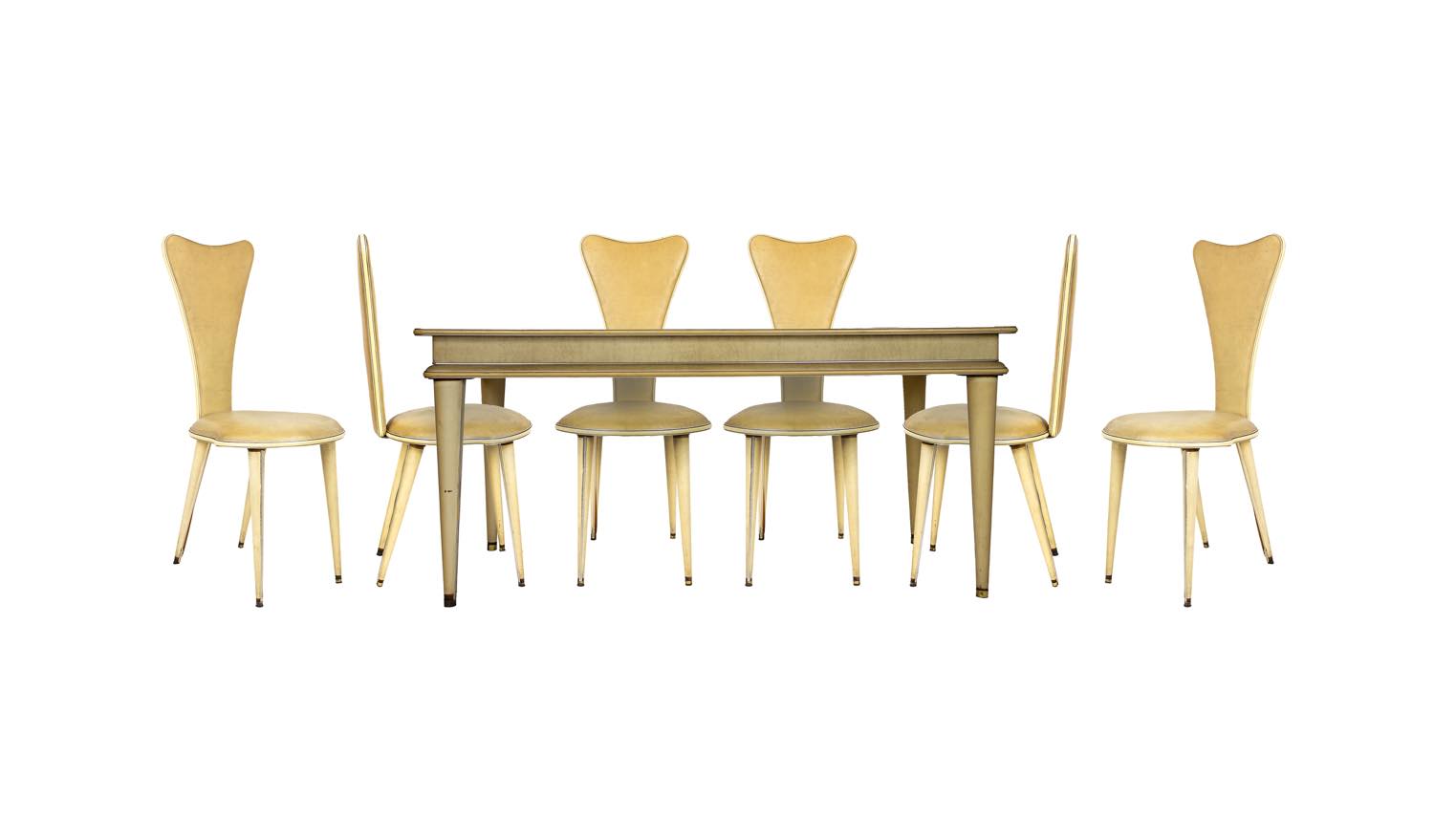 Set di sei sedie e tavolo da pranzo. Alcuni segni di usura.