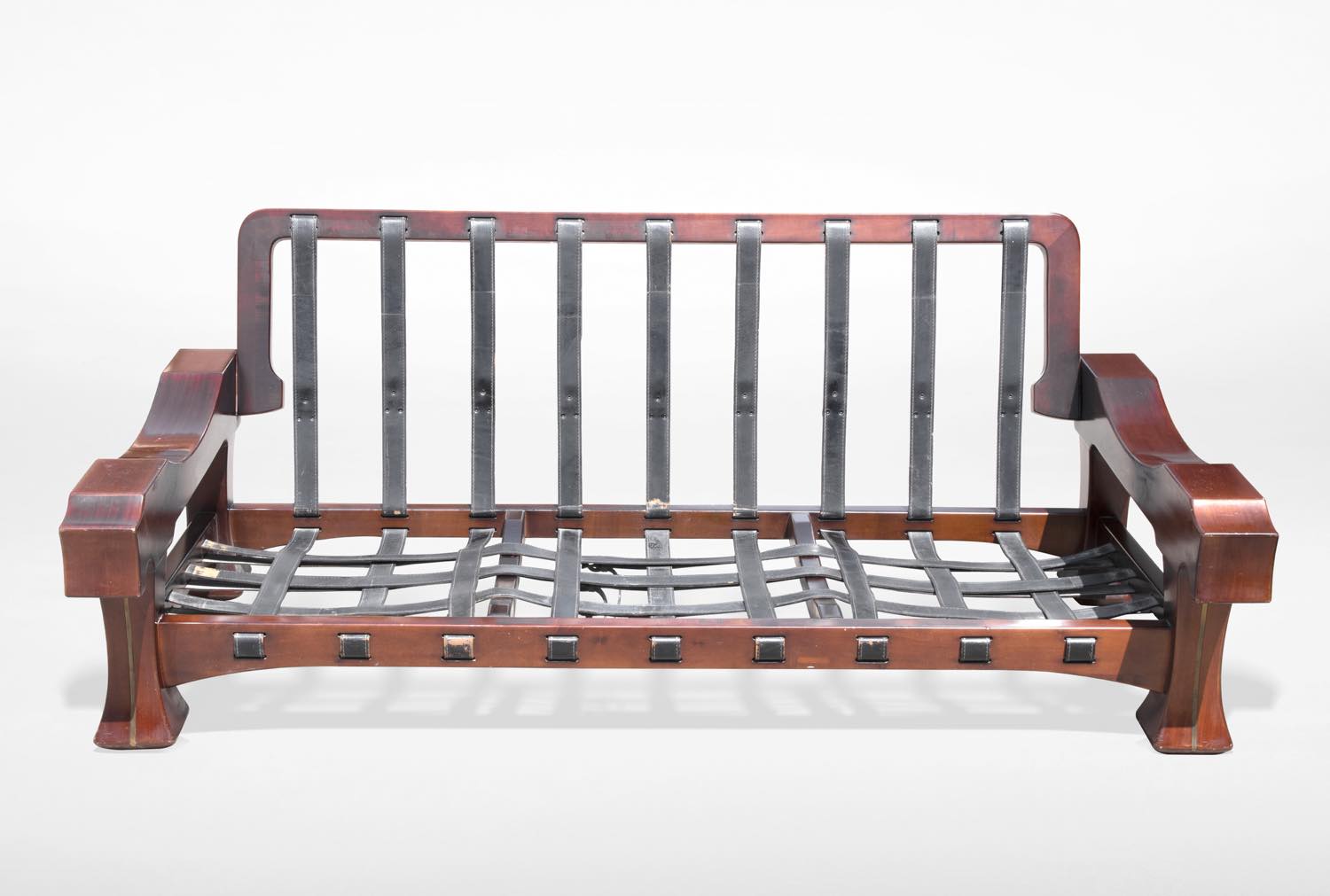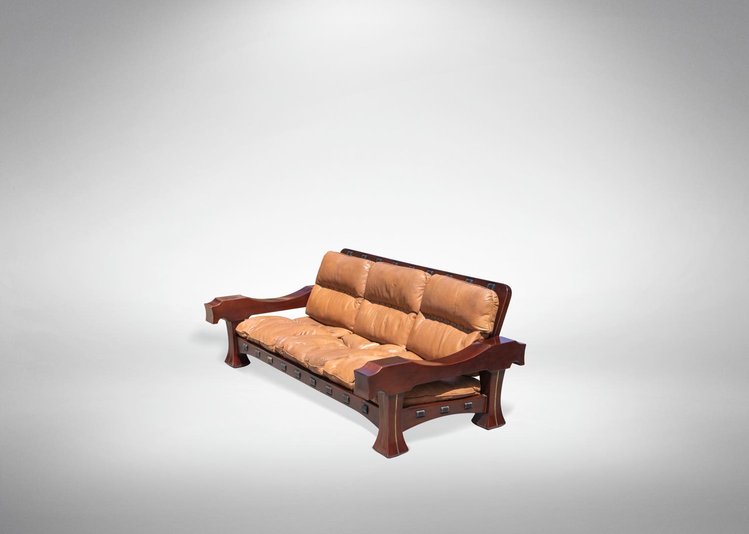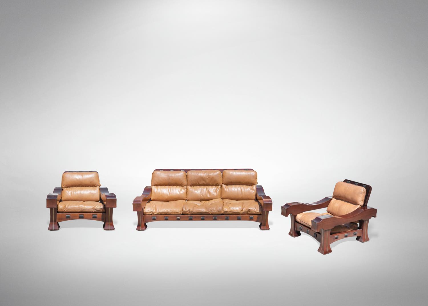 Il set è composto da un divano e 2 poltrone. Interamente in mogano, realizzato in legno e pelle.