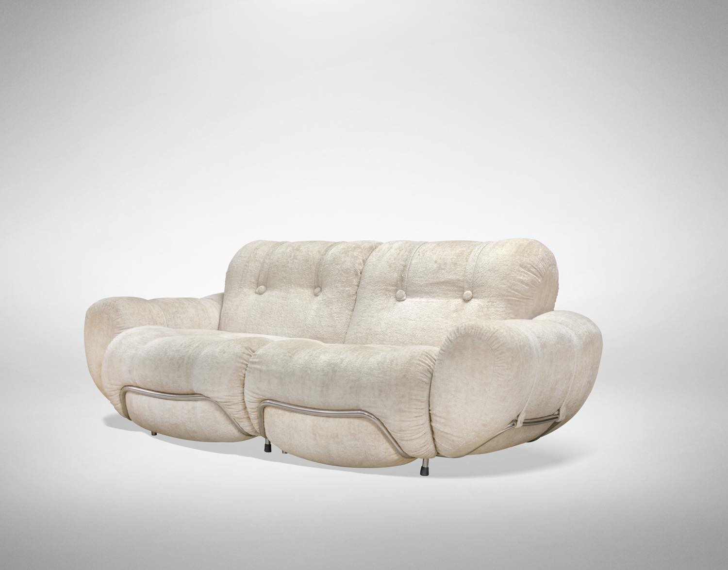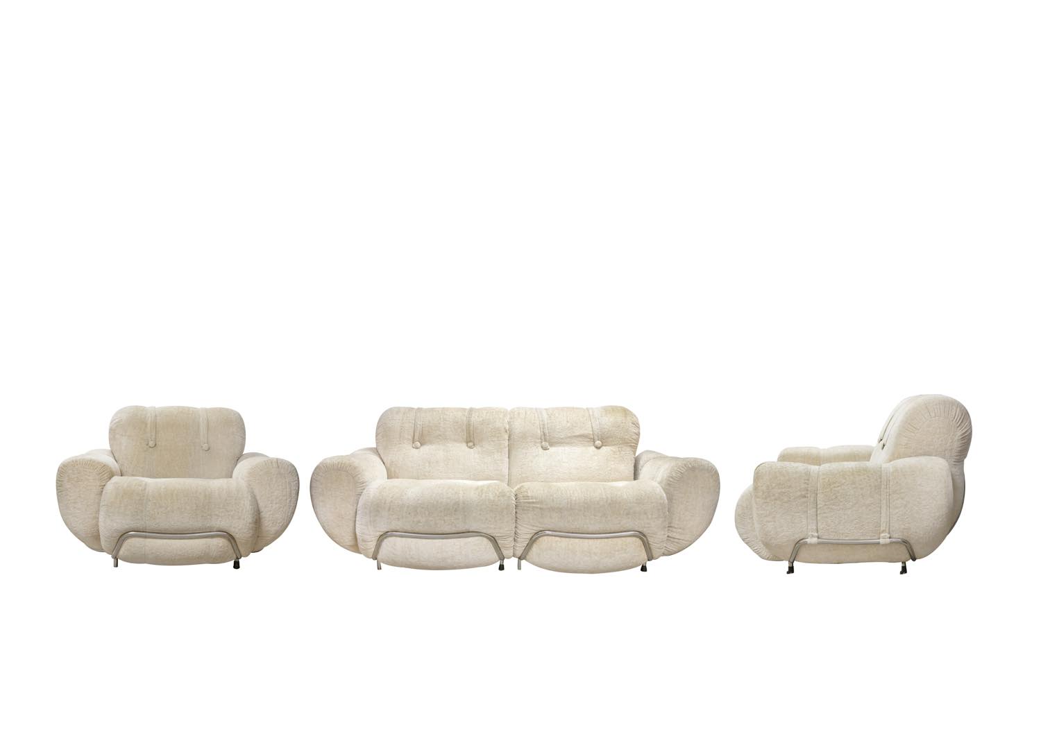 Set di divano e poltrone in metallo e tessuto, progettato e realizzato negli anni '70, nello stile di Adriano Piazzesi. Ottime condizioni.