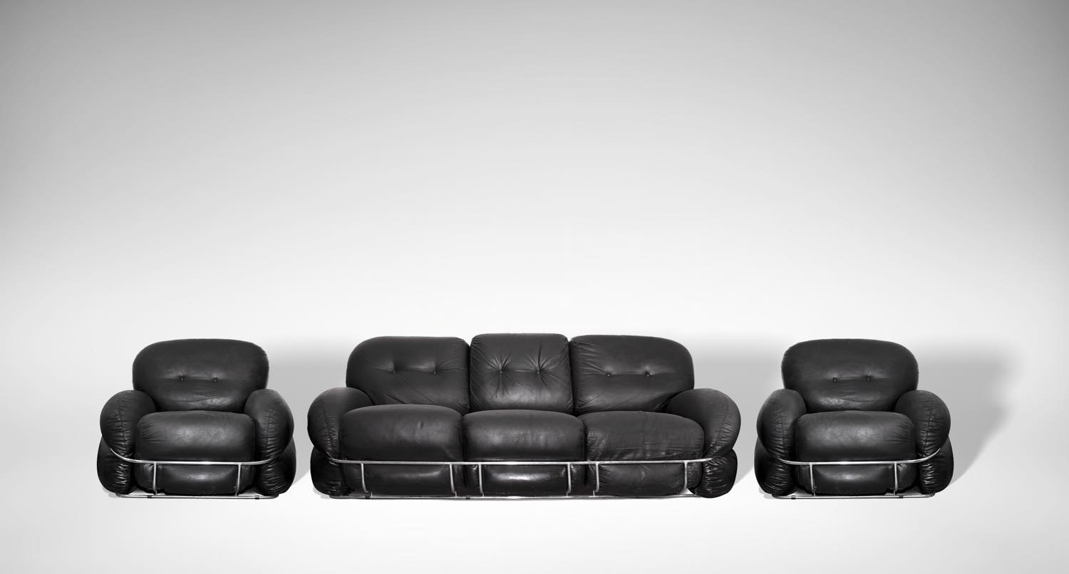 Set composto da 2 poltrone e un sofà da 3 posti realizzato da Piazzesi per Space Age. Condizioni eccellenti.
