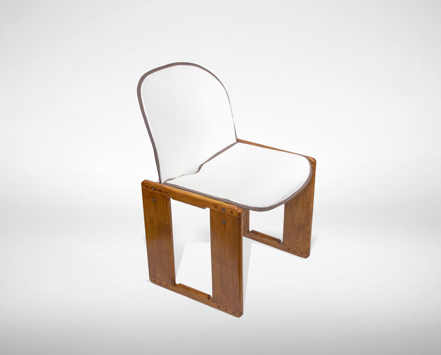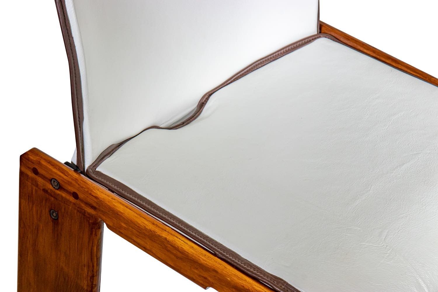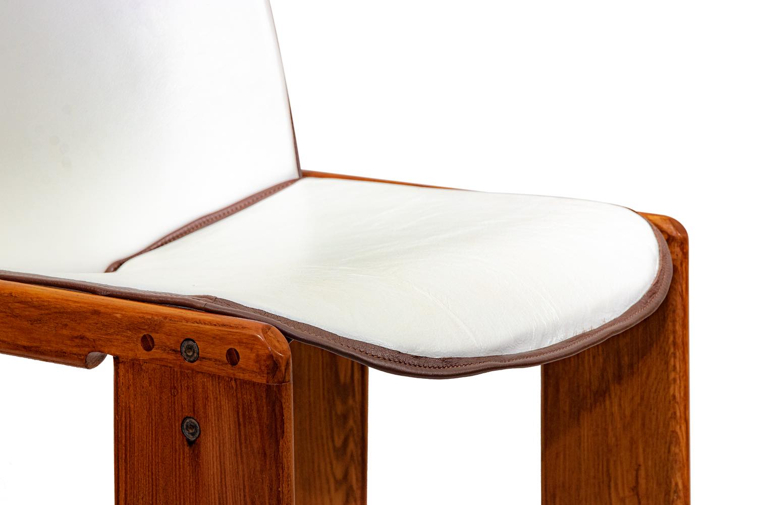 Le sedie sono costituite da una struttura in frassino naturale e da una seduta e uno schienale in fibra di vetro rivestiti in pelle bianca. La struttura recupera il tipico doppio cavalletto Scarpa.