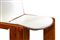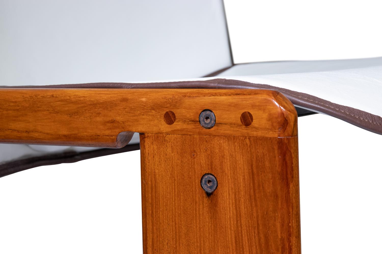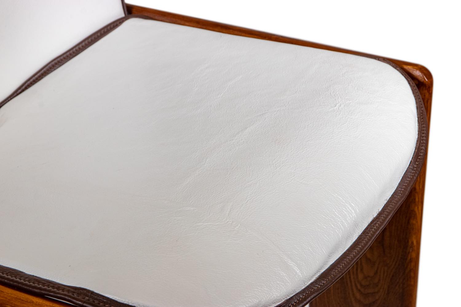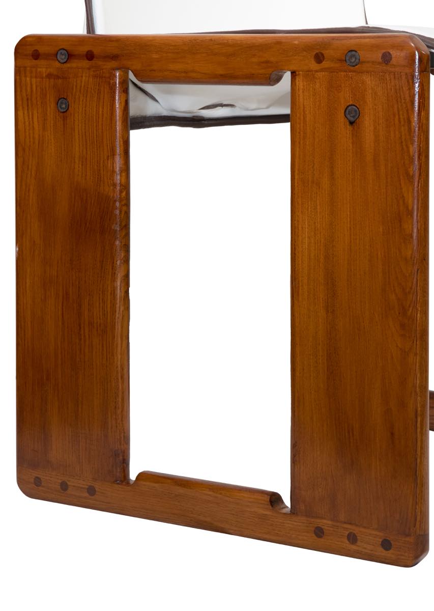 Le sedie sono costituite da una struttura in frassino naturale e da una seduta e uno schienale in fibra di vetro rivestiti in pelle bianca. La struttura recupera il tipico doppio cavalletto Scarpa.