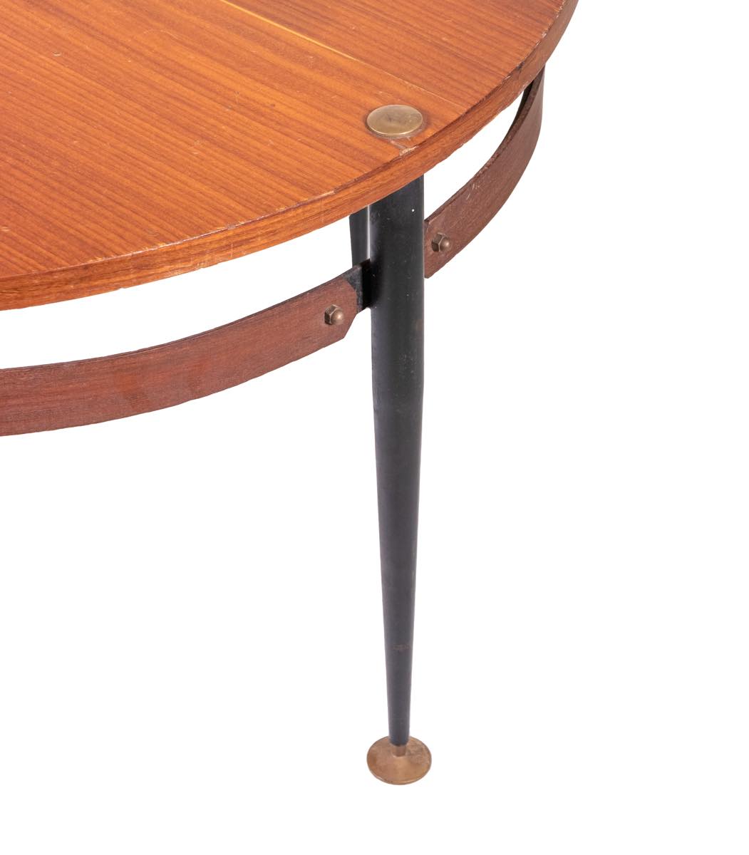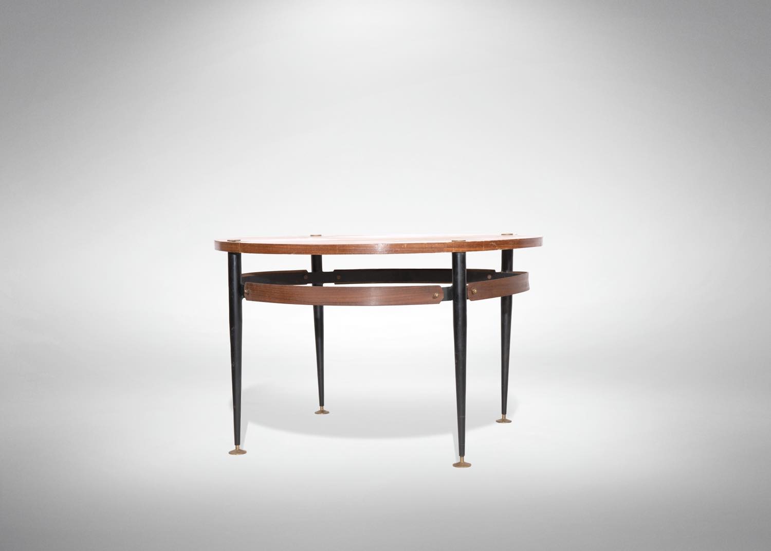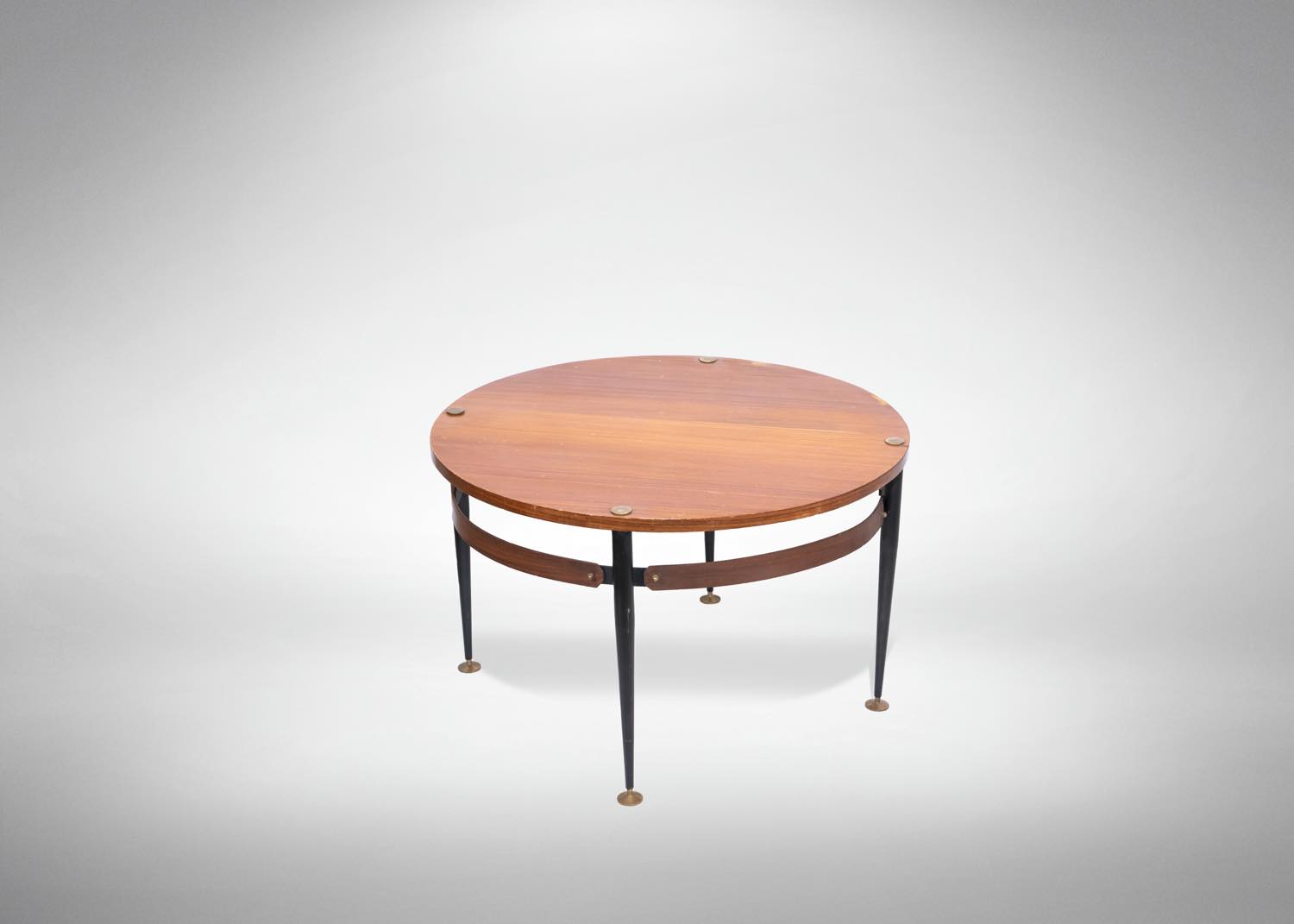 tavolino da caffè in legno, metallo e ottone dal design raffinato.