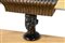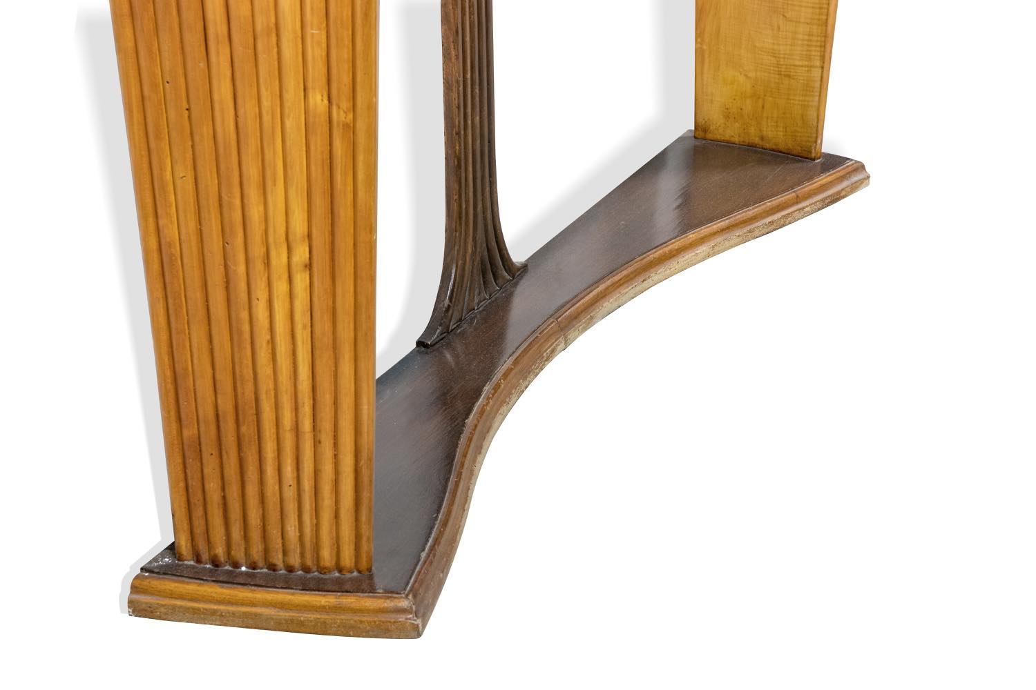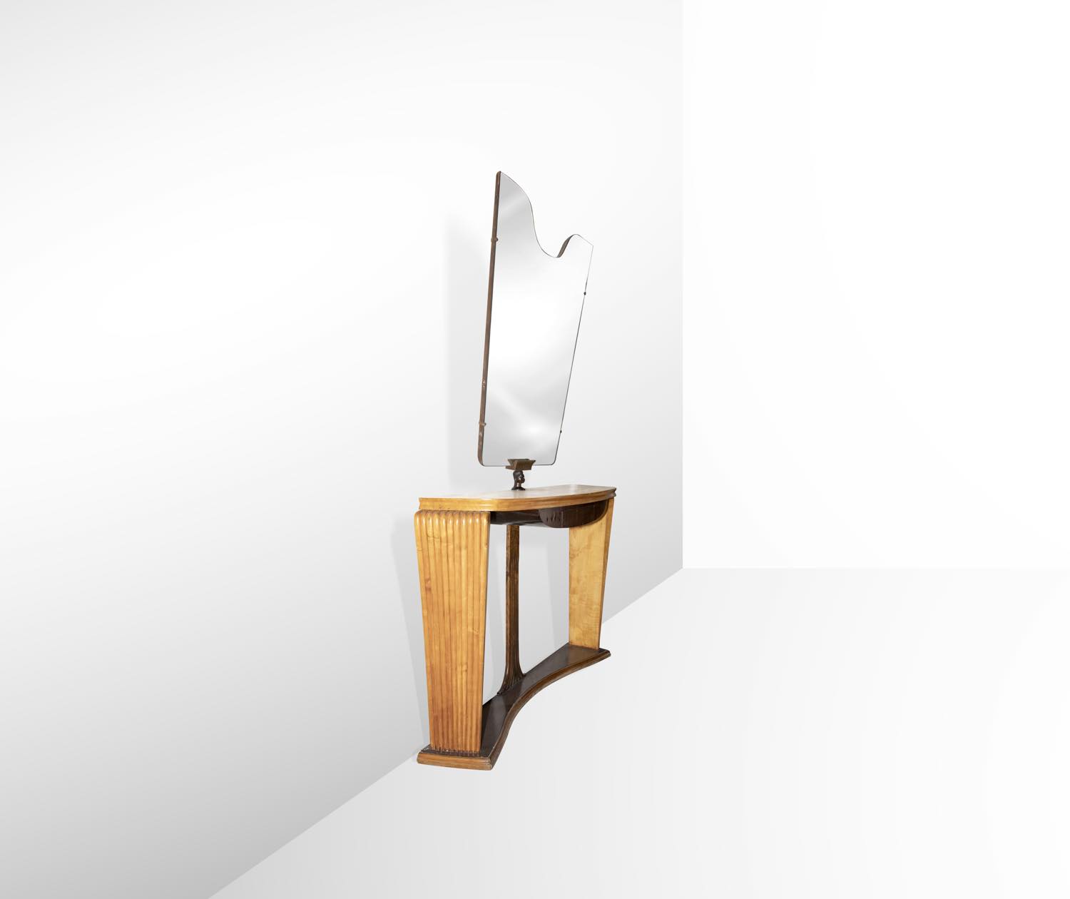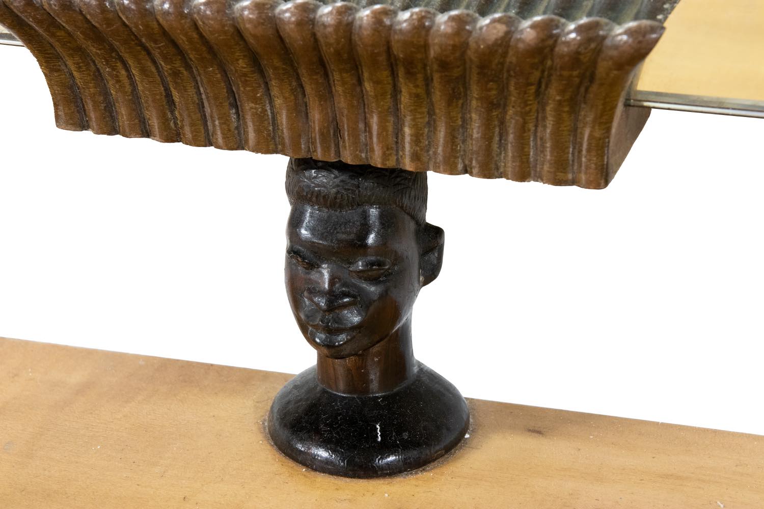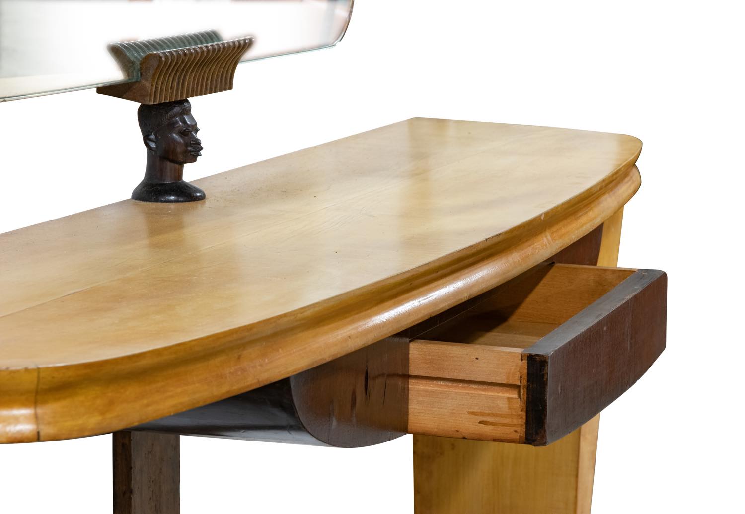 Elegante consolle in legno dal design unico realizzata da Osvaldo Borsani. Lo specchio è sorretto da una piccola scultura a forma di testa tribale.