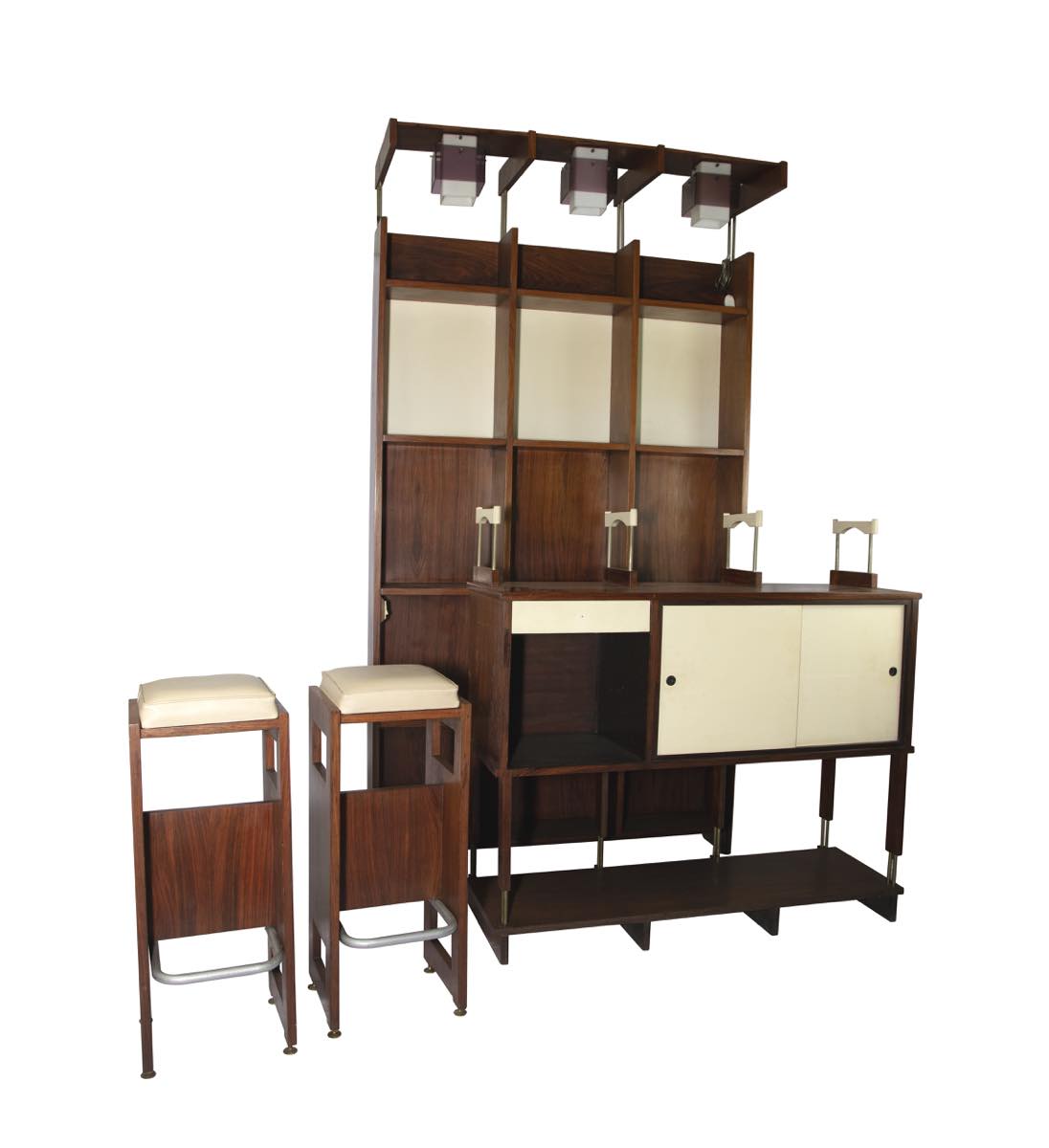Set da bar composto da bancone, bancone posteriore e due sgabelli in noce, skai, ottone, legno laccato, cristallo molato. Faretti in perspex opalino e perspex trasparente colorato.
