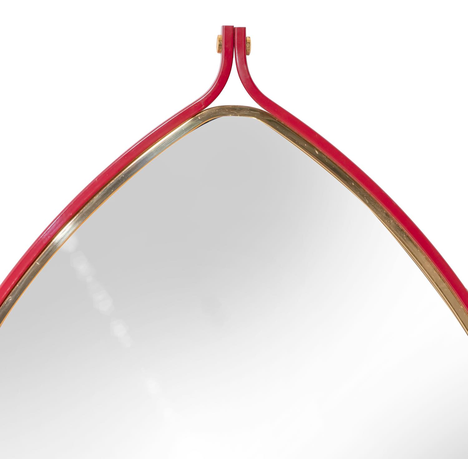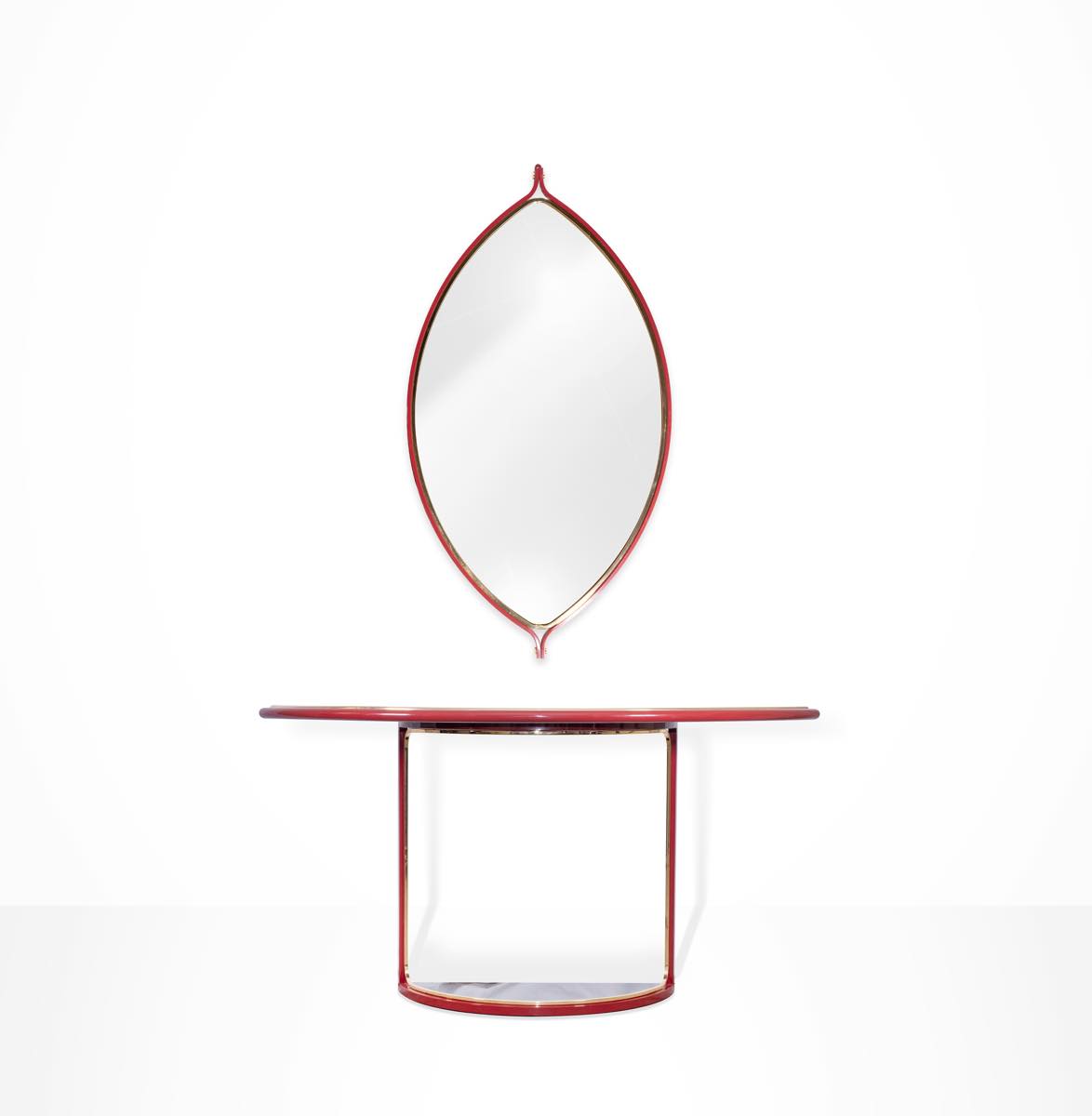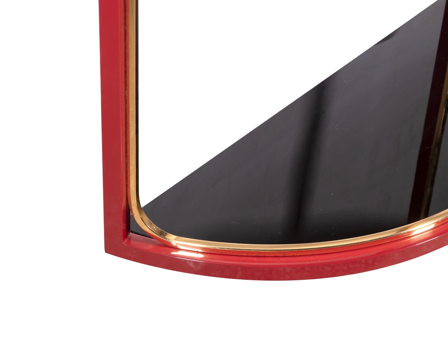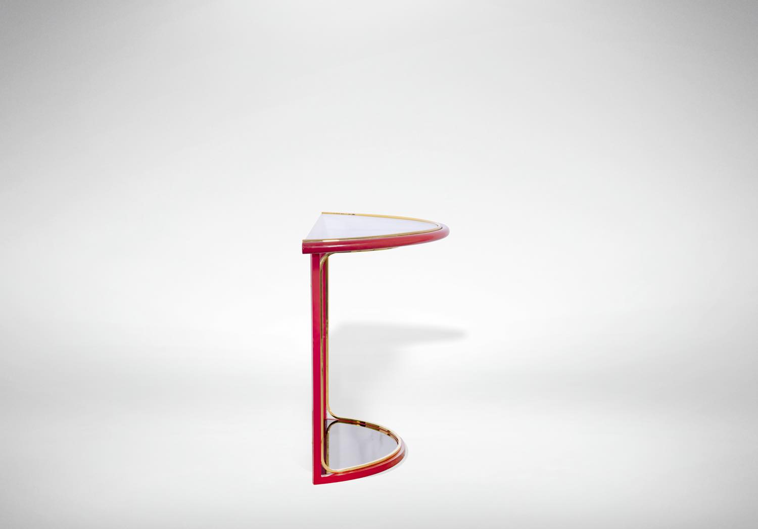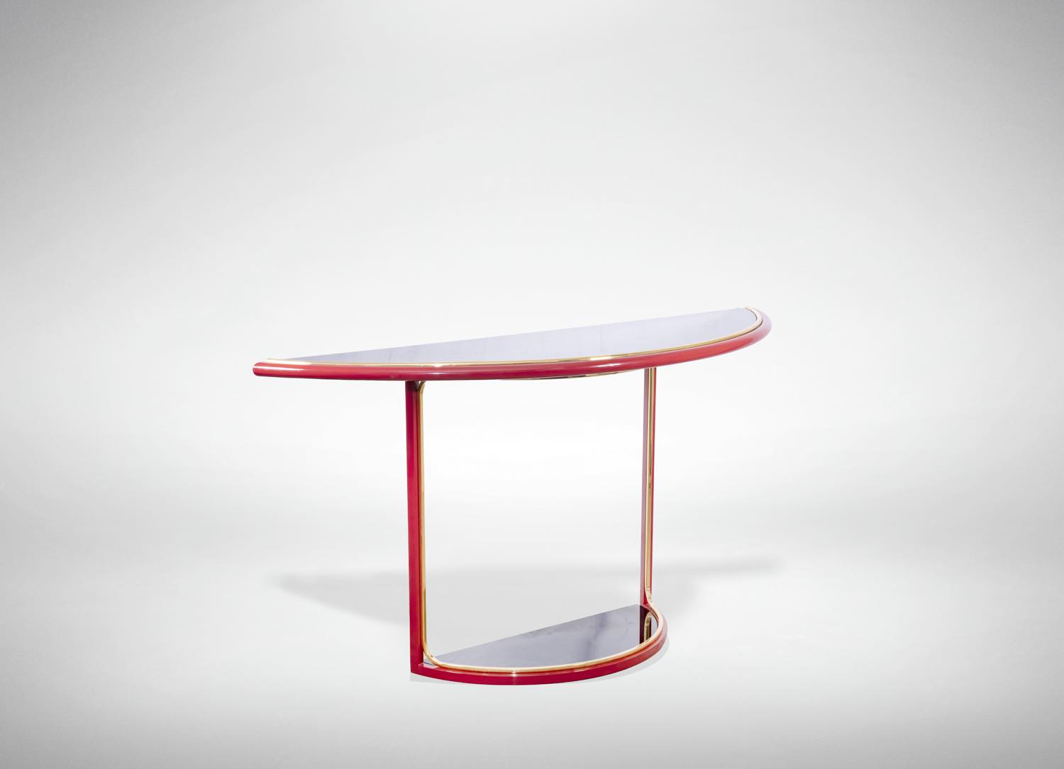 Raro esemplare di consolle rossa, nera e giallo oro, laccata in metallo, ottone e vetro.