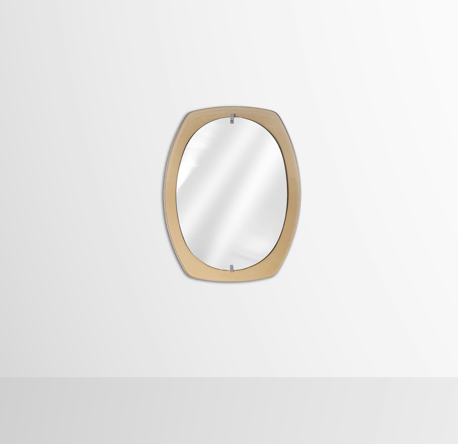 Specchio "Veca" con cornice in vetro caramellato e teste di vite in ottone nichelato.