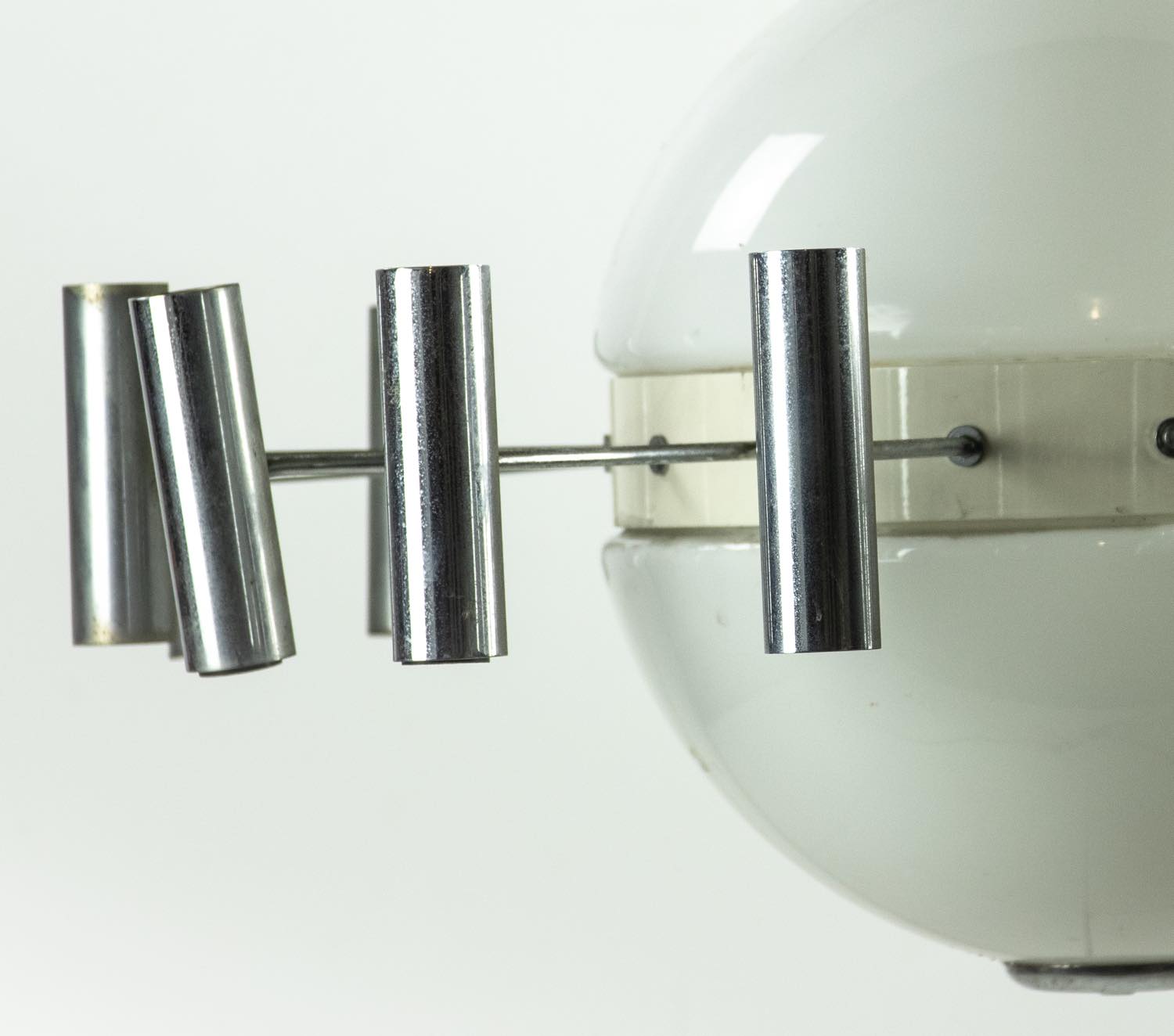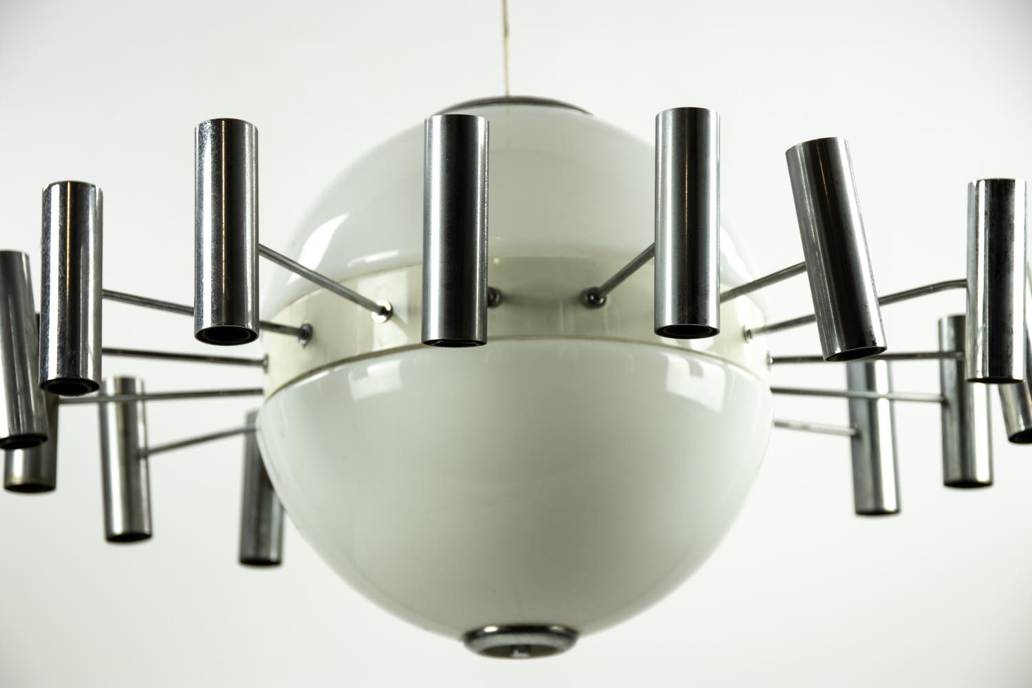 Lampadario vintage con una struttura metallica a raggiera e una lampada al centro. Realizzato da Spaceage.