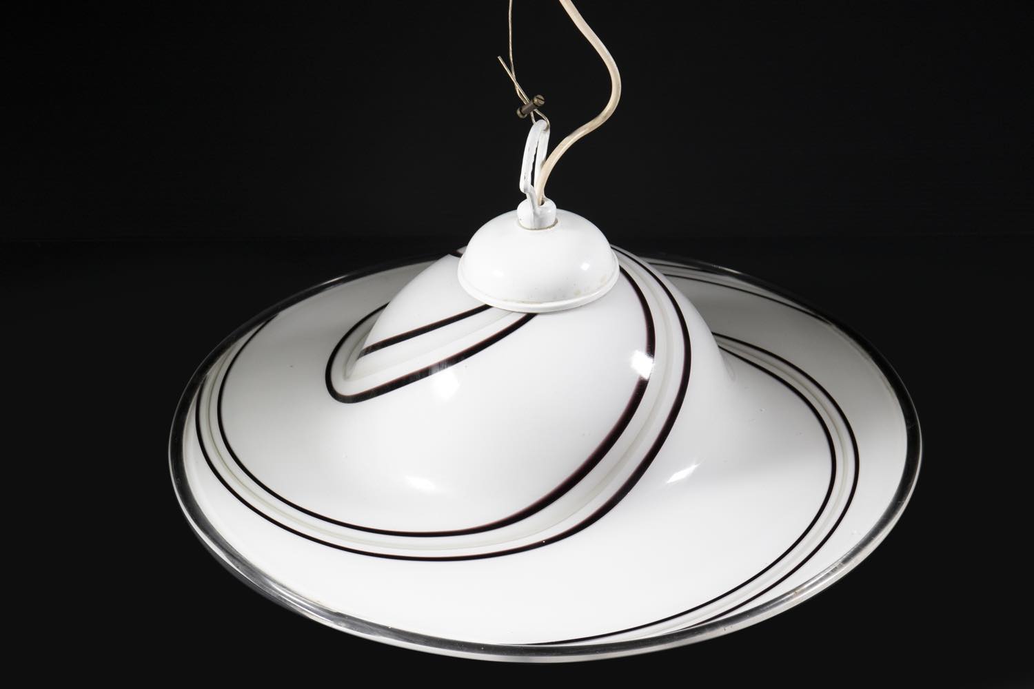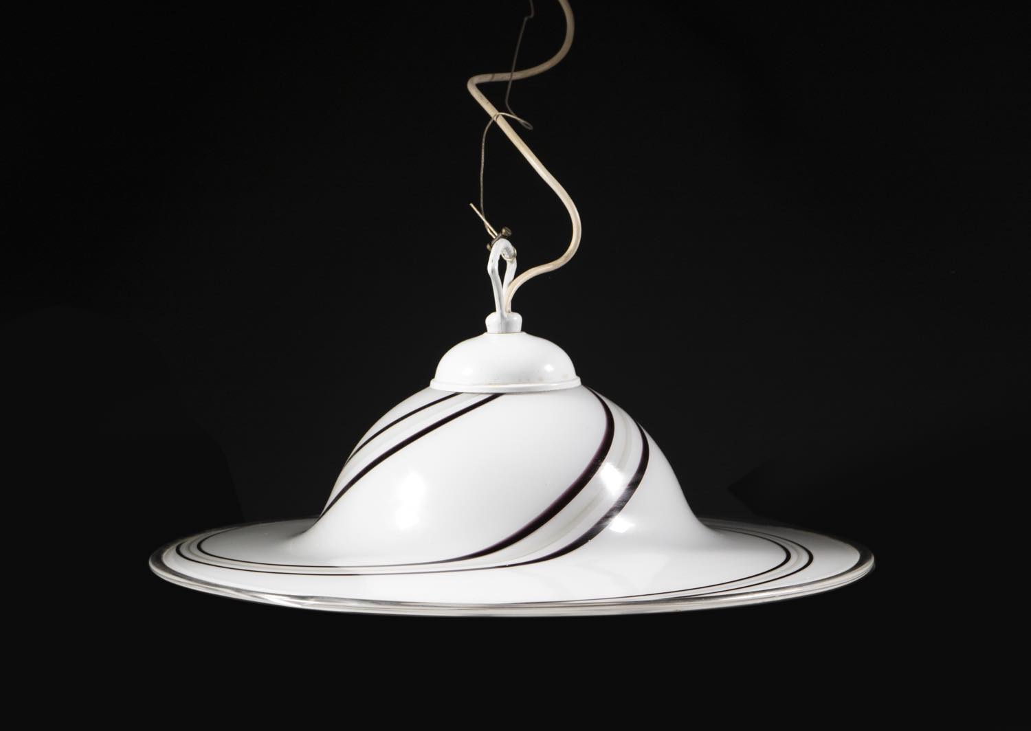 Lampadario vintage con paralume in vetro di Murano bianco e nero.