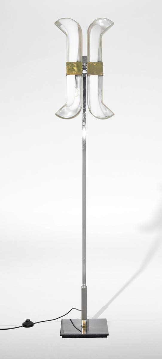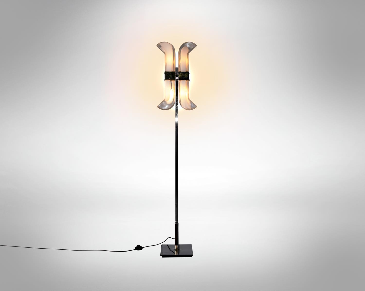 Lampada di design realizzata da Gaetano Sciolari per Stikronen, anni '70. Base in acciaio con dettagli in ottone, quattro lampadine in vetro di Murano. Rara lampada in acciaio specchiato in ottime condizioni.
