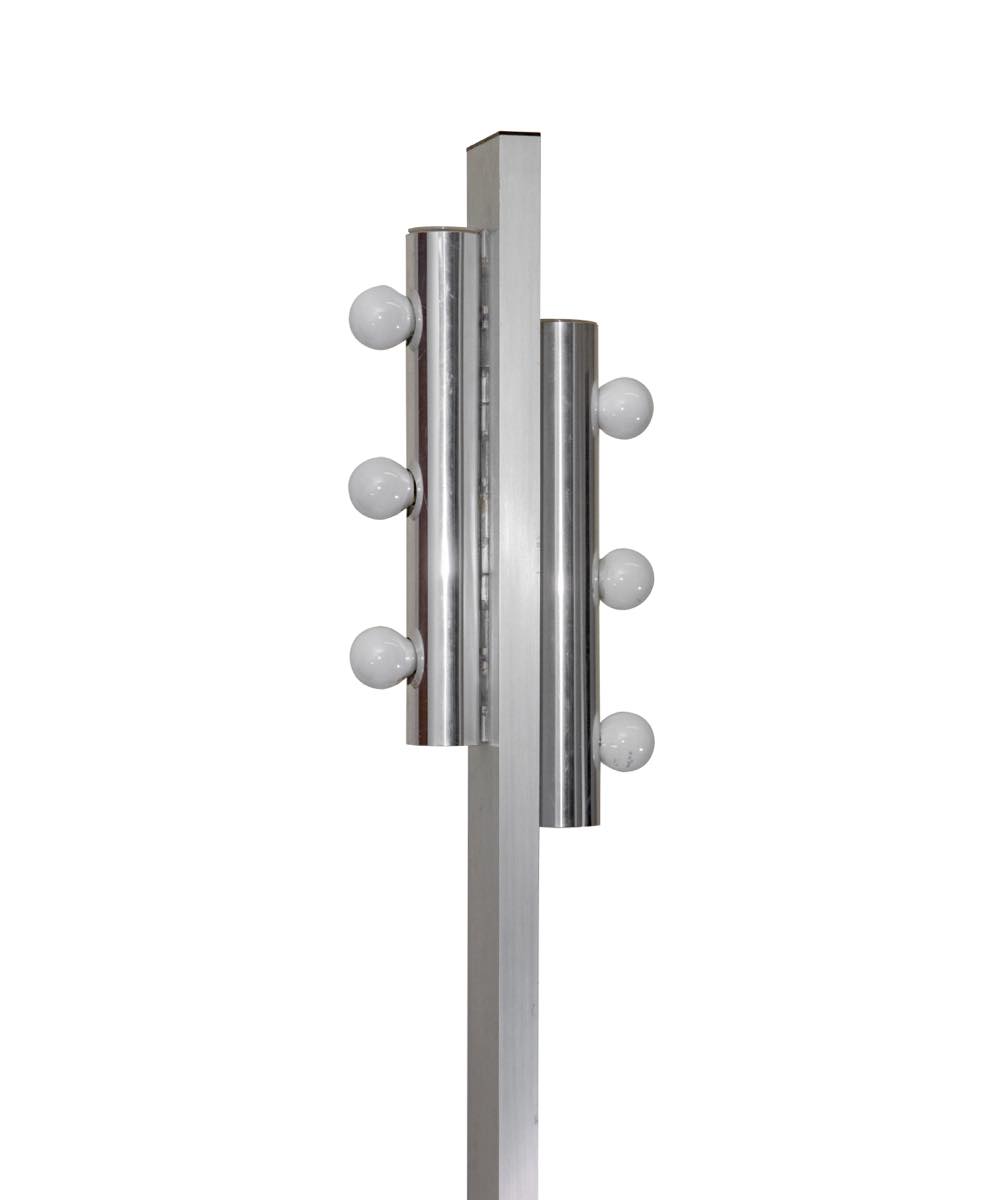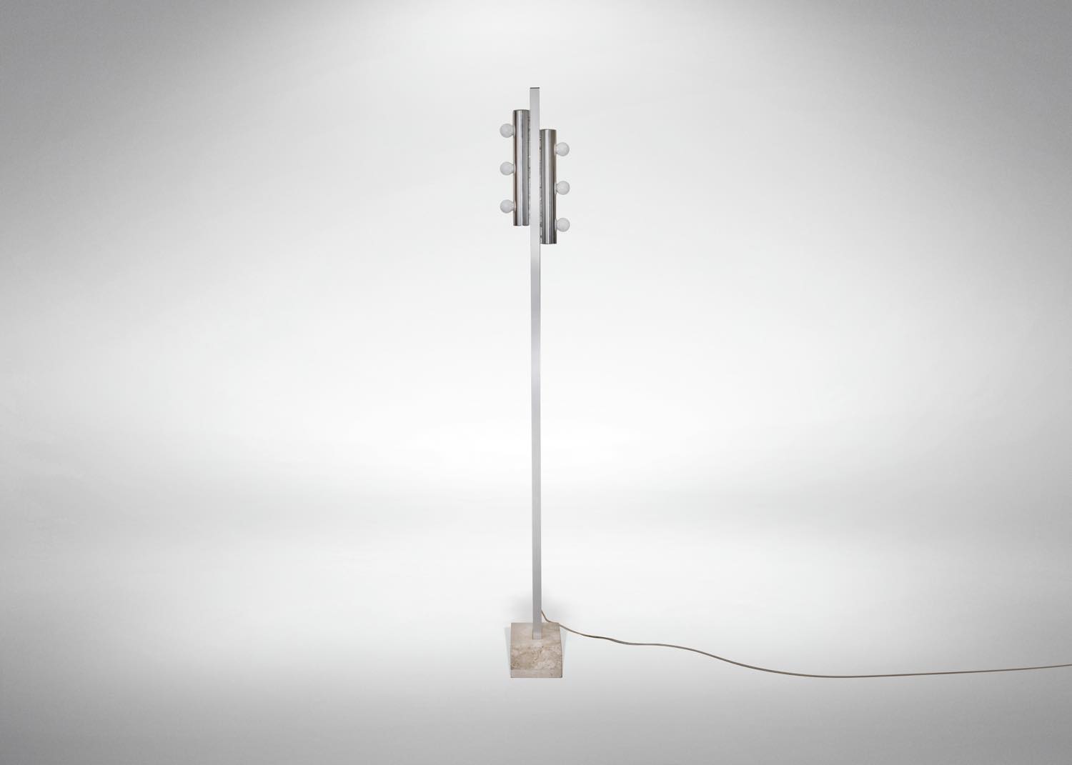 Un'unica lampada da terra cromata con base in marmo e sei lampade. Realizzata da Targetti.