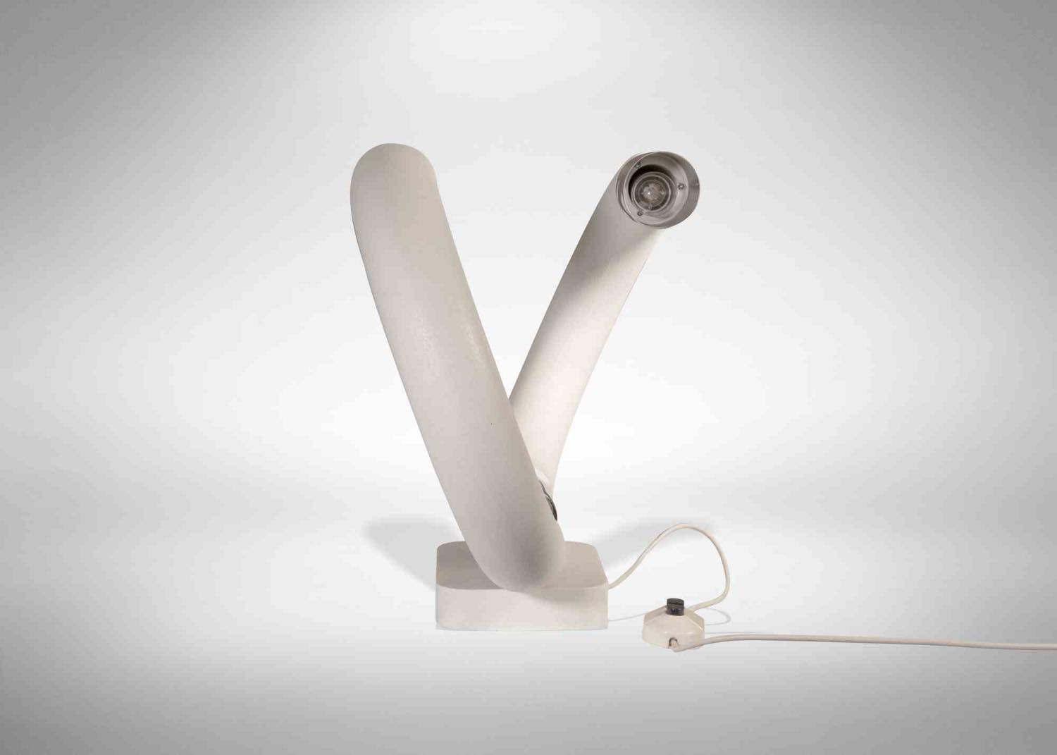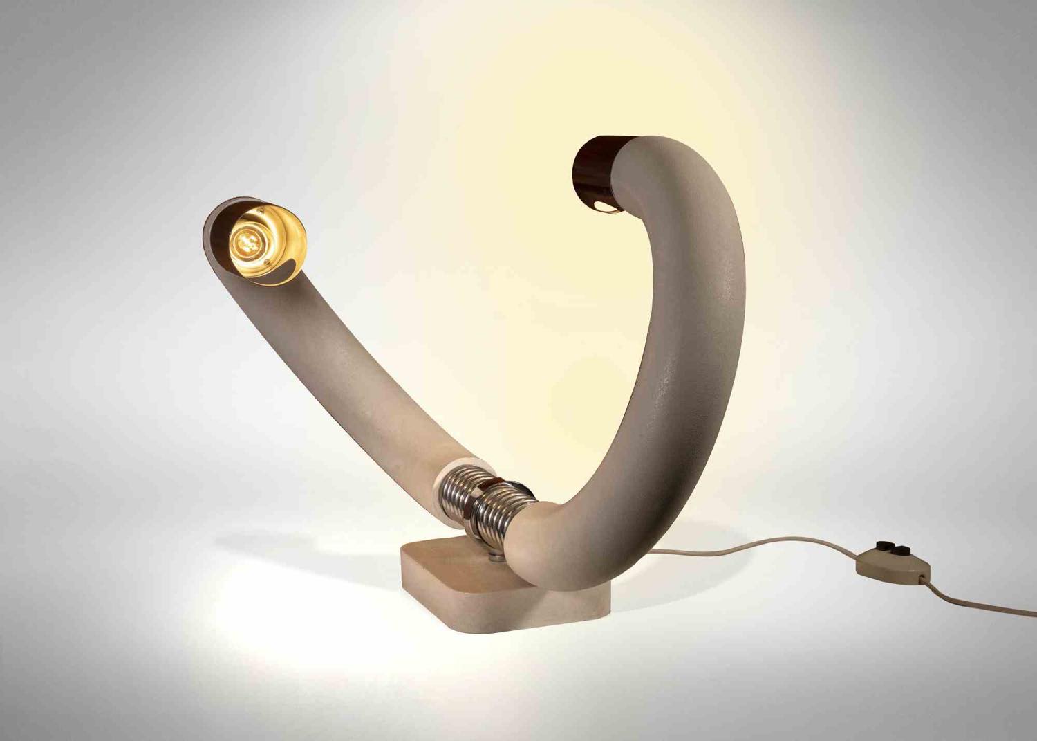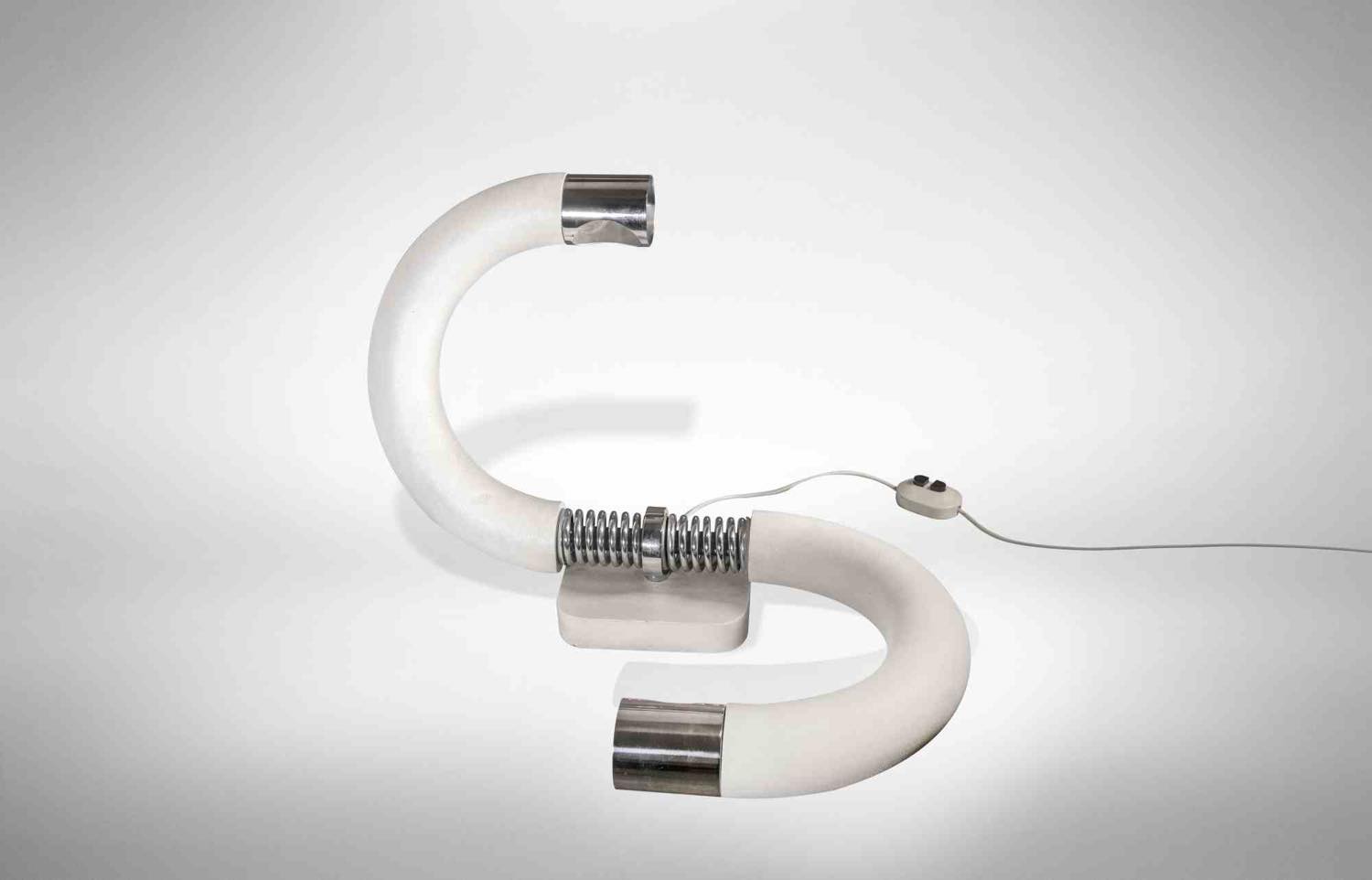 Una lampada da tavolo realizzata per Lumi in acciaio e metallo cromato laccato bianco.