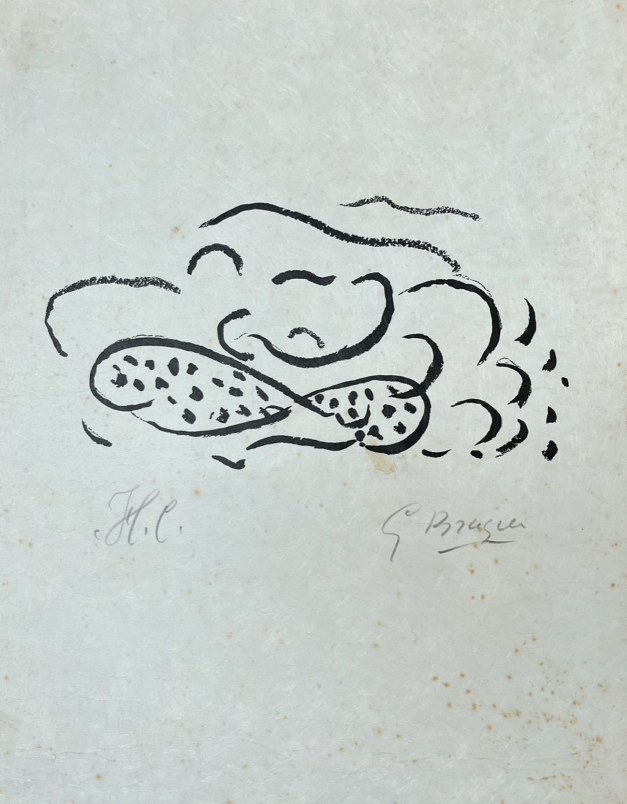 BRAQUE GEORGES (1882 - 1963) Dalla suite "Si je mourais là-bas". 1962. Litografia su carta giappone. Cm 47,00 x 37,00. H.c. Tiratura e firma in basso a matita. Edizione totale: 70 esemplari + h.c. Stampatore: Féquet et Baudier. Editore: Louis Broder. Pubblicazione: Braque - The Complete Graphics, Catalogue Raisonne, Dora Vallier, Gallery Books, W.H. Smith Publishers, NY, 1982, n° 181. Difetti.