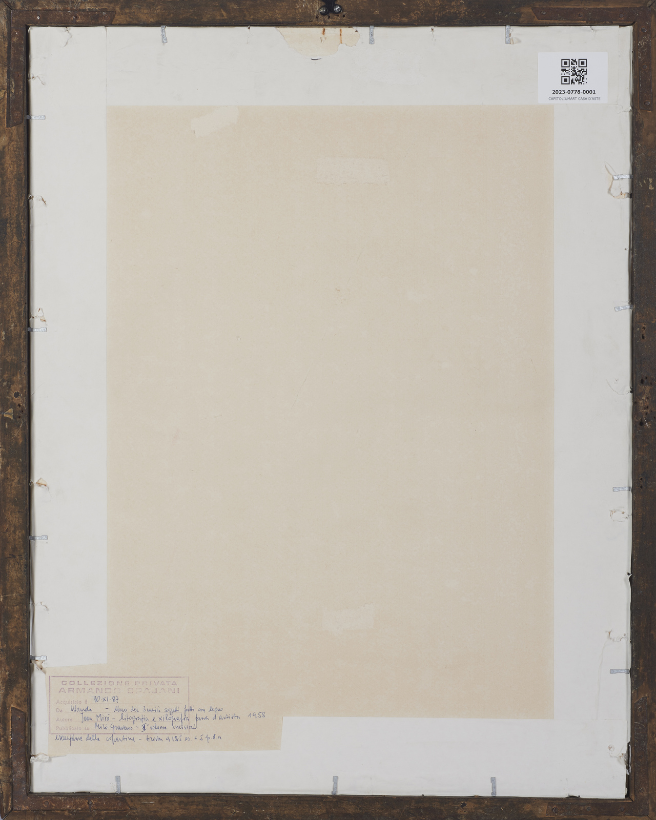 MIRO' JOAN (1893 - 1983) From 'À Toute Épreuve'. 1958. Incisione su legno a colori.. Cm 36,50 x 52,00. P.a.Tiratura e firma in basso a matita. Edizione totale: 125 esemplari + 5 prove d'artista. Pubblicazioni: Mirò Greaveur, a cura di Jacques Dupin, volume II, n. 235. Stampatore: Fequet et Baudier, Parigi. Editore: Gérald Cramer, Geneva e the Galerie Berggruen, Parigi. Lievi difetti. Cornice presente