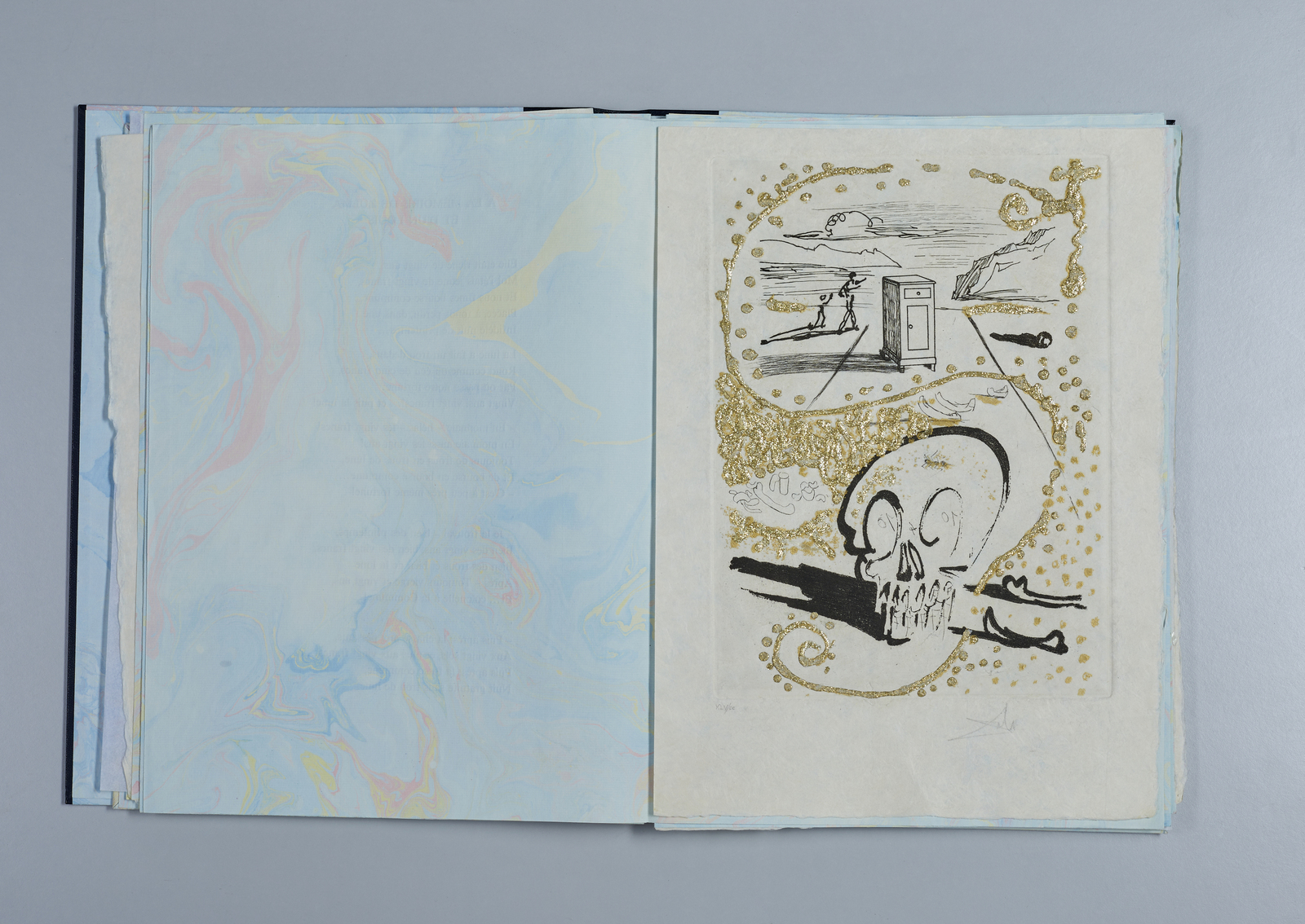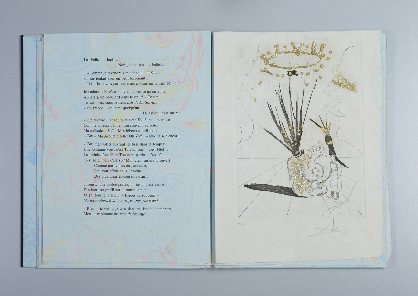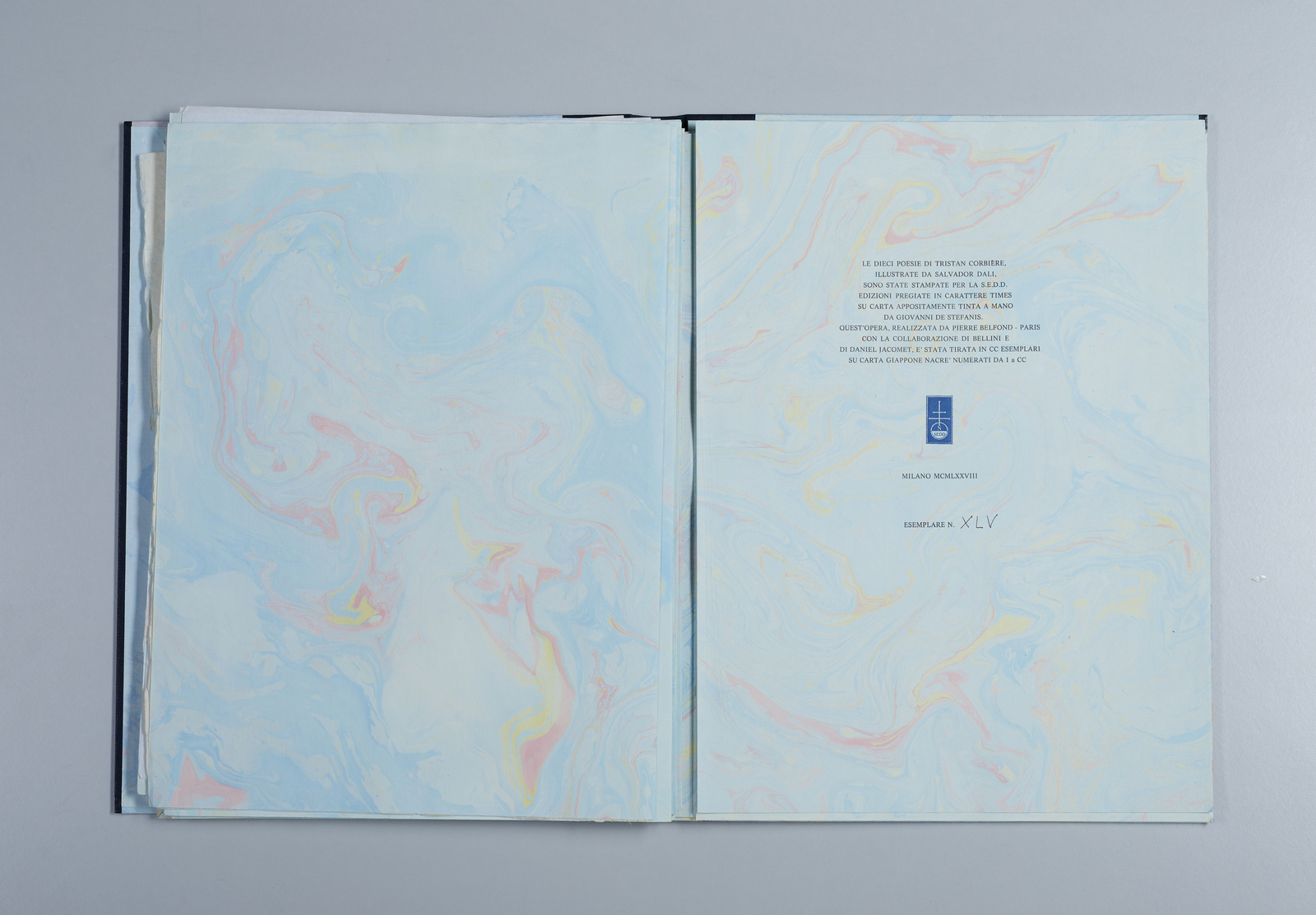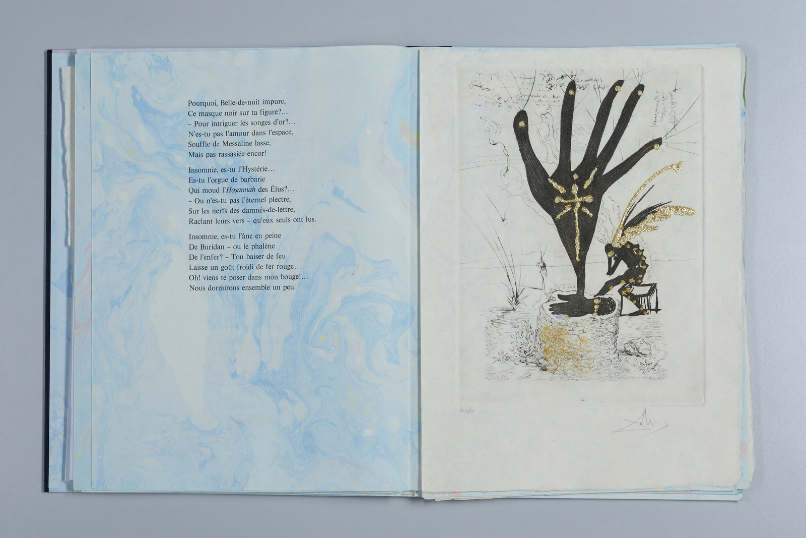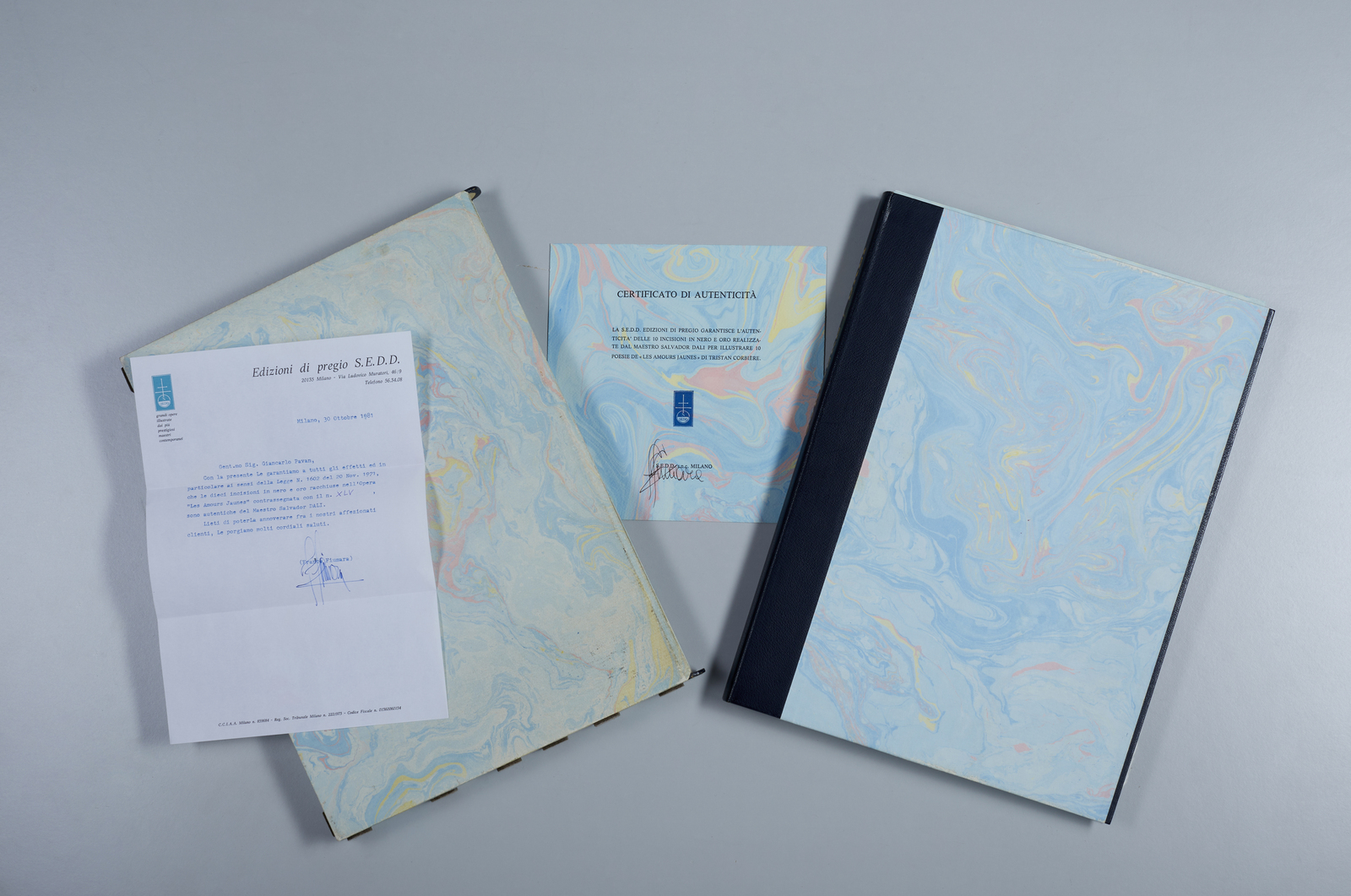 DALI' SALVADOR (1904 - 1989) Les Amours Jaunes. . 1978. Incisione (cartella completa). Cm 30,00 x 40,00. XLV/CC. Ogni foglio presenta tiratura e firma in basso a matita.Tiratura sul colophon.Dimensione foglio: 38x28 cm. Dimensione lastra: 30x21.5 cm. Raccolta di 10 acquetinte e collage nero e oro a foglio sciolto, che illustrano le poesie de "Les Amours Jaunes" di Tristan Corbière: La Poète contumace; À l'éternel Madame; À la mémoire de Zulma; Fleur d'Art; Bonne fortune et fortune; Déclin; Insomnie; Pudentiane; Duel aux camélias; Le crapaud. Opera realizzata da Pierre Belafond, Parigi, con la collaborazione di Bellini e di Daniel Jacomet. Edizione totale: CC esemplari numerati da I/CC a CC/CC. Editore: S.e.d.d. edizioni pregiate, Milano. Carta giappone nacré tinta a mano da Giovanni de Stefanis. Certificato di Autenticità a cura di S.E.E.D, Milano. Pubblicazione: Dalì il genio, Arti Grafiche Favia srl, Bari, 2011, pg. 66 - 78 .