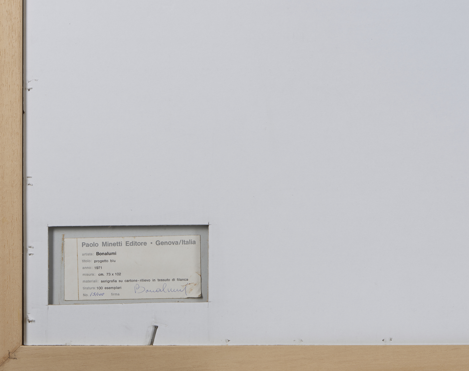 BONALUMI AGOSTINO (1935 - 2013) Progetto blu. 1971. Serigrafia su cartone e rilievo. Cm 102,00 x 73,00. 15/100. Tiratura, firma e anno in basso a matita. Al retro cartiglio descrittivo Paolo Minetti Editore Genova, con firma dell'artista. Edizione totale: 100 esemplari. Editore: Paolo Minetti, Genova. Lievi difetti. Cornice presente