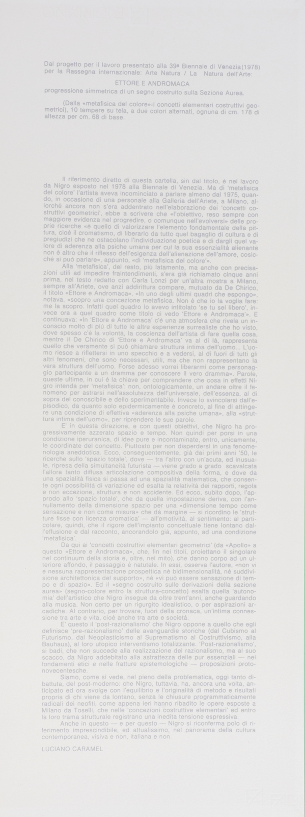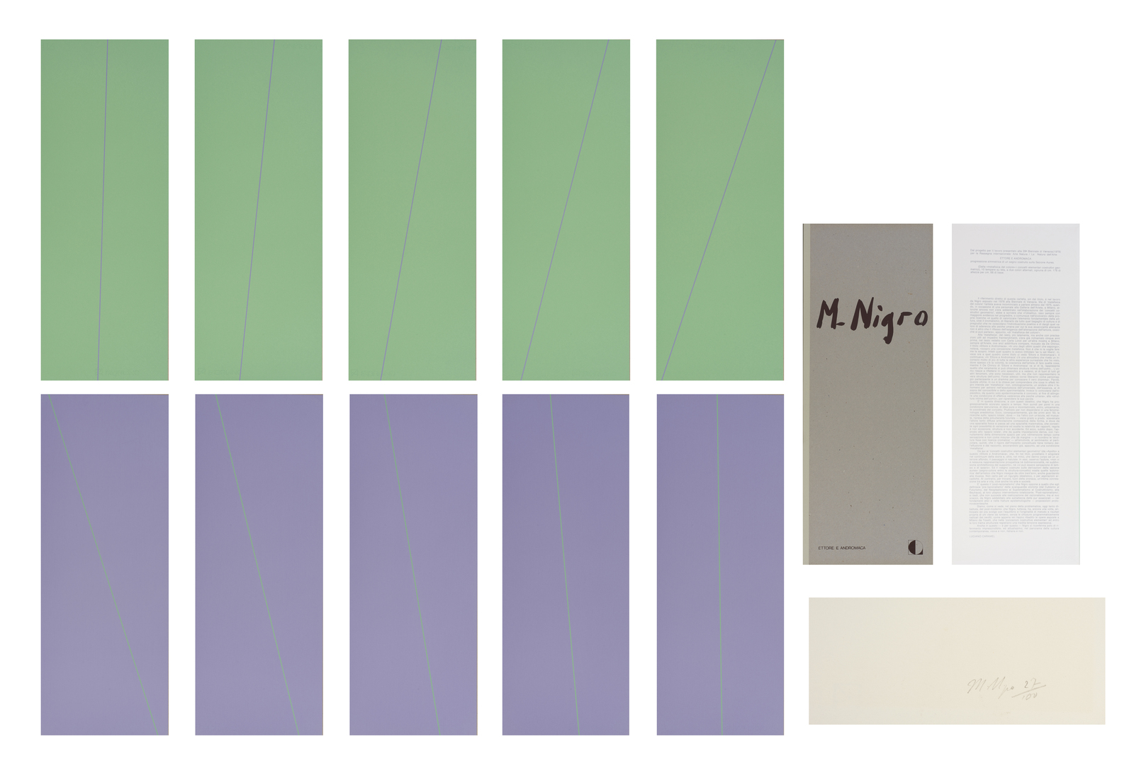 NIGRO MARIO (1917 - 1992) Ettore e Andromaca. Serigrafia (cartella completa). Cm 26,50 x 70,00. 27/100. Cartella composta da n.10 fogli firmati e numerati al retro a matita. Entro custodia originale. Editore Studio d’Arte Contemporanea Dabbeni. Le dimensioni segnalate in catalogo sono di ciascun foglio. L’opera è stata realizzata dal progetto per il lavoro presentato alla 39° Biennale di Venezia (1978) per la Rassegna Internazionale: Arte Natura/ La Natura dell’Arte: “ETTORE e ANDROMACA”. Prefazione contenuta nella cartella a cura del prof. Luciano Caramel.