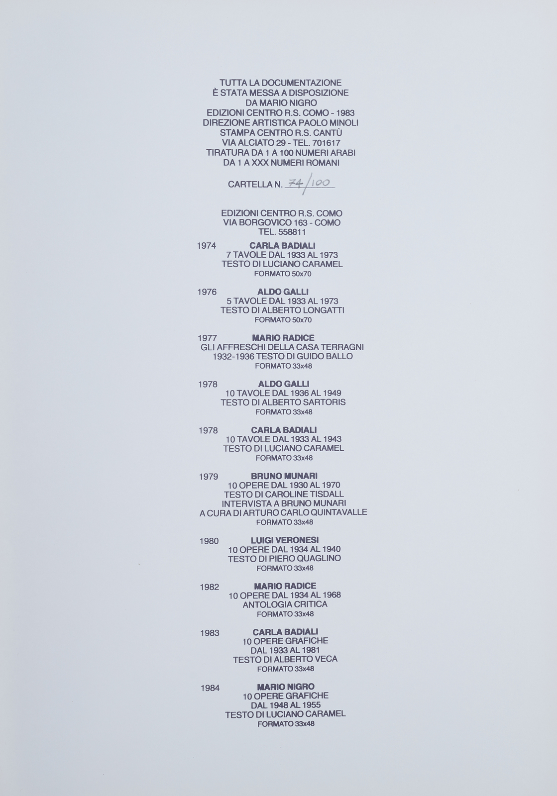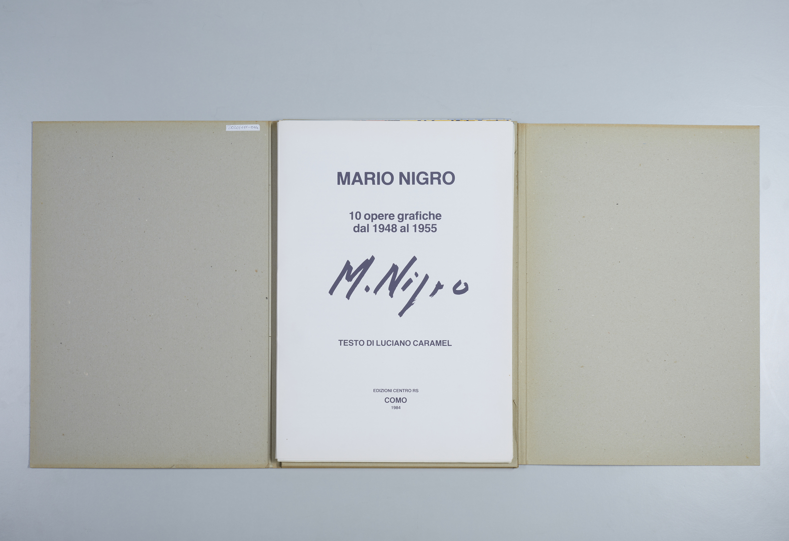 NIGRO MARIO (1917 - 1992) Cartella completa 10 opere grafiche dal 1948 al 1955. 1984. Serigrafia (cartella completa). Cm 33,00 x 49,00. 74/100 . Tiratura a matita sul colophon. Ogni foglio presenta tiratura, firma e anno in basso a matita.Testo di Luciano Caramel. Edizione totale: 100 + XXX esemplari. Editore: Edizioni Centro RS, Como. Stampatore: Centro RS, Cantù.