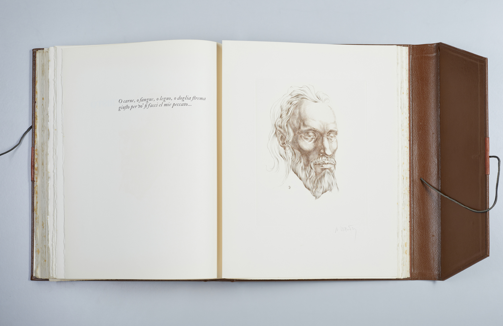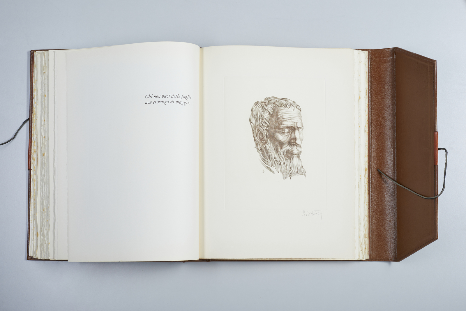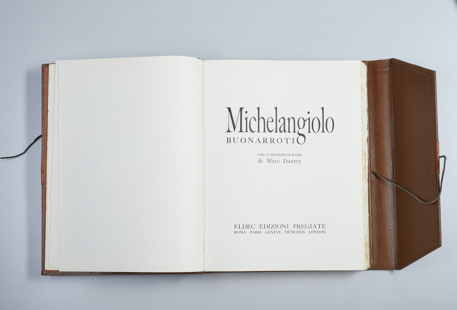 DAUTRY MARC (1930 - 2008) Michelangiolo Buonarroti. 1975. Libro d'artista. Cm 35,50 x 44,00 x 5,00. 1229/2000. Raccolta di 2 volumi contenenti 17 incisioni in rame. Firma a matita su ogni foglio. Edizione totale: 2000 esemplari di cui 30 fuori commercio, 8 ad personam corredati da una lastra originale in rame, 16 ad personam accompagnati da un disegno originale in sanguigna, 126 corredati da una serie di incisioni su carta giappone con numeri da I a CXXVI, 1820 completi di incisioni su carta arches, numerati da 1 a 1820. Dimensione foglio: 43x32.5 cm. Dimensione lastra: 26.7x20.7 cm. Editore: Eldec spa Edizioni pregiate, Roma. Carta a mano Grand Velin d'Arches, Cartiere Arches. Stampate in torchio a mano da Manuel Robbe. Il carattere del testo Caslin Two Lines Pica è stato fuso appositamente per questa edizione dalla Foderia Caslon Radiguer di Parigi su matrici originali del 1734. La composizione a mano, l'impaginazione e la stampa tipografica sono state eseguite da Yvette e Jean Paul Vibert. Legatura eseguita dalla Legatoria Conti Borbone di Milano. Lievi difetti.