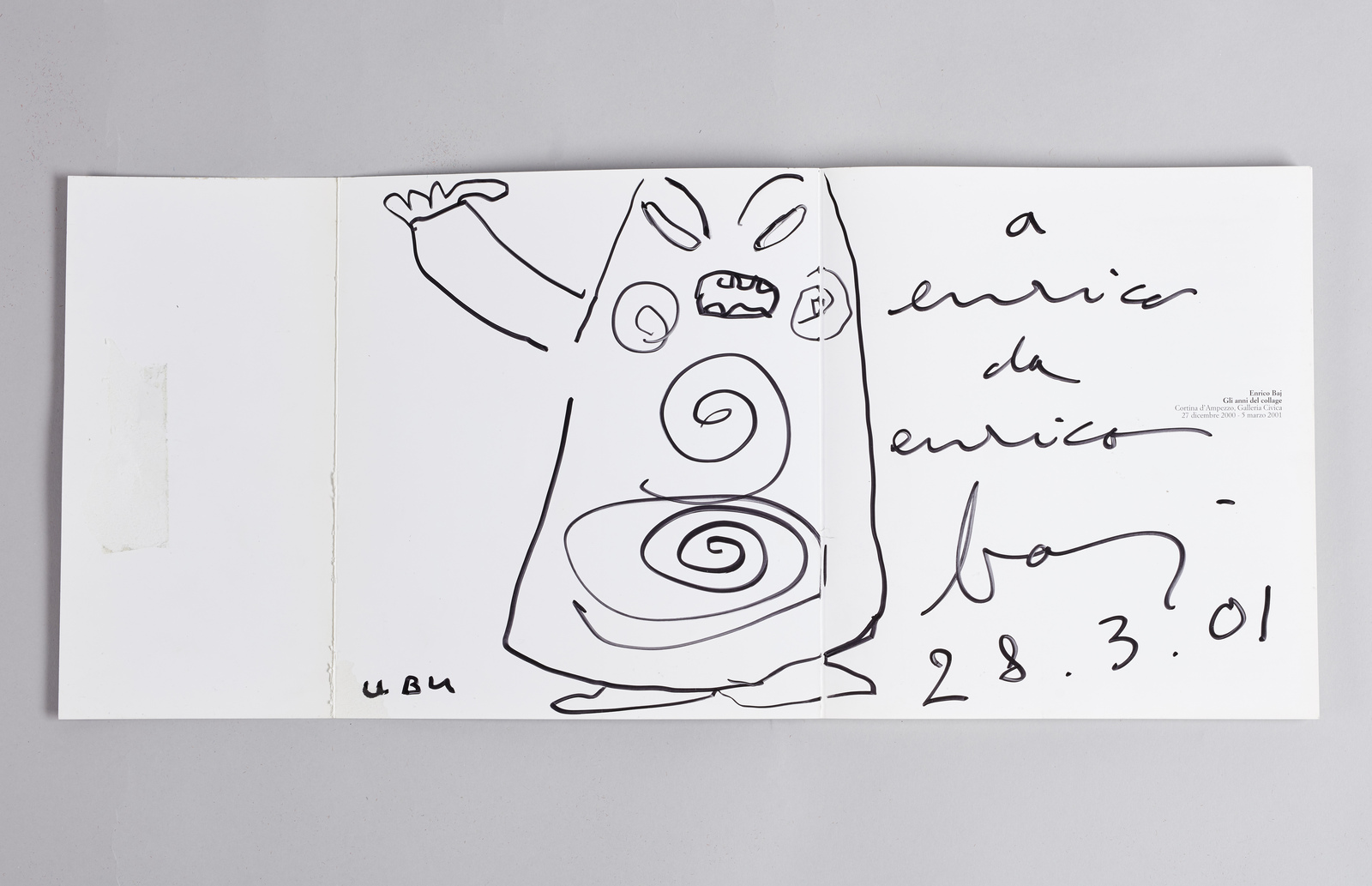 BAJ ENRICO (1924 - 2003) Enrico Baj: Gli anni del Collage. . 2000. Libro con intervento dell'artista. Cm 43,00 x 24,00. Firma, anno, dedica e disegno a pennarello all'interno del catalogo della mostra "Enrico Baj: gli anni del collage", Cortina d'Ampezzo, Galleria Civica 27 Dicembre 2000 - 05 Marzo 2001. Edizioni Gabriele Mazzotta, Milano. Lievi difetti.
