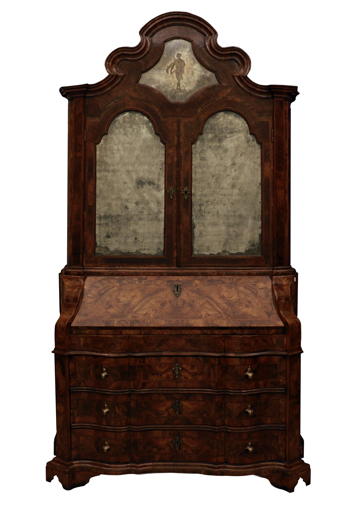 Fronte a tre cassetti sormontato da calatoia mistilinea a ribalta celante diversi tiretti, cassetti e vani sagomati. Sportelletto interno centrale tra due lesene.