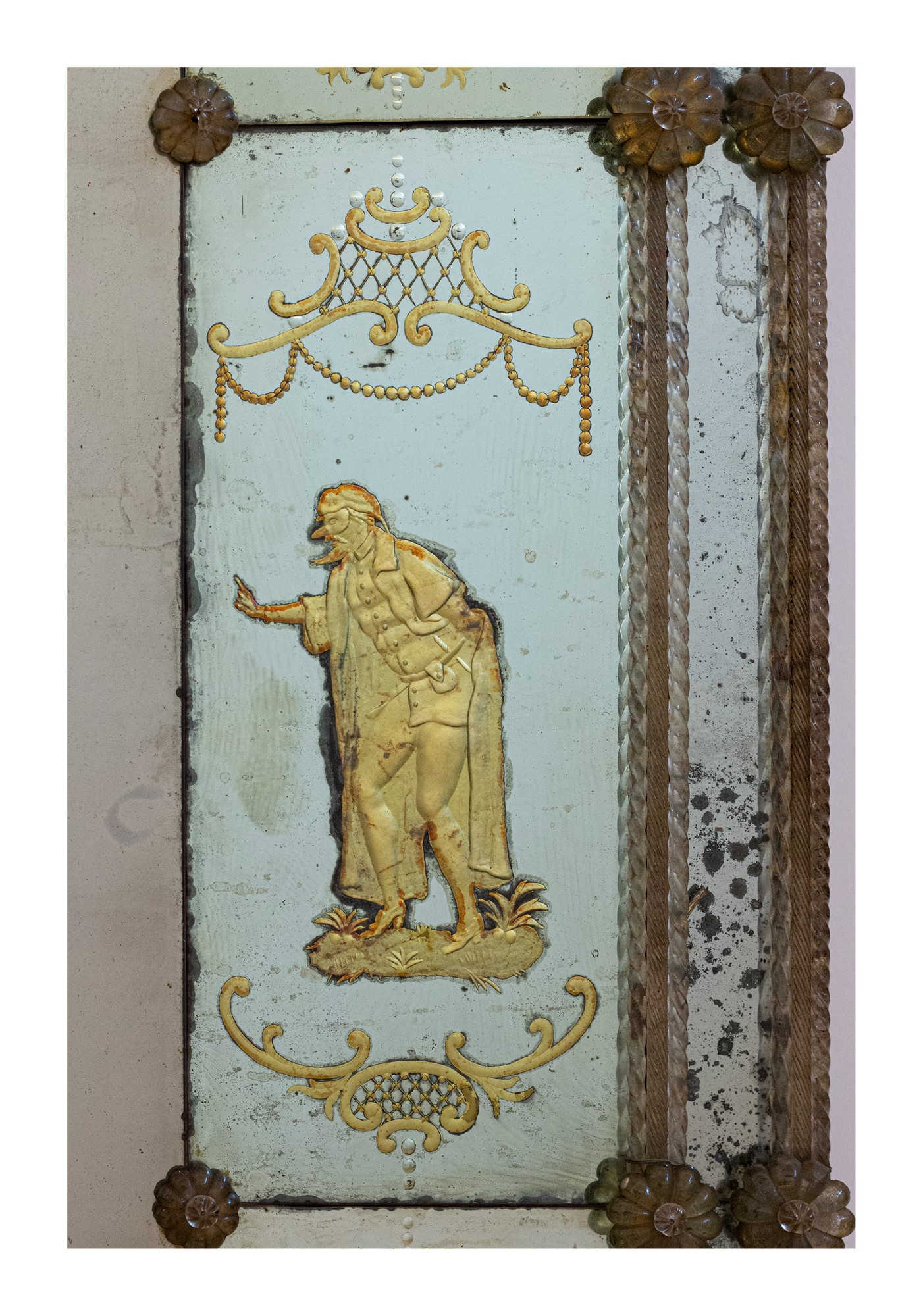 Antica specchiera di Murano decorata con elementi floreale a rilievo e scene veneziane incise e dorate. fine del XIX secolo
