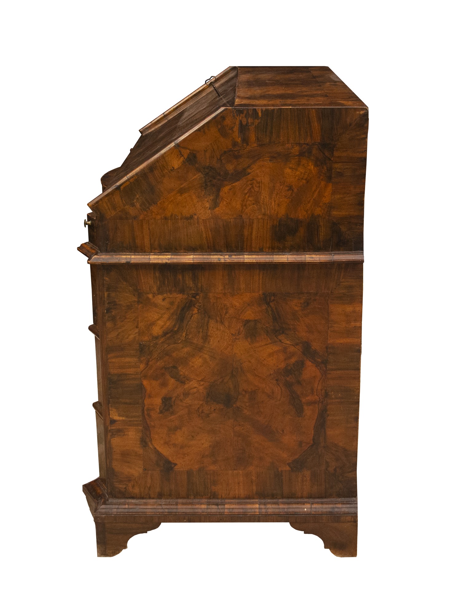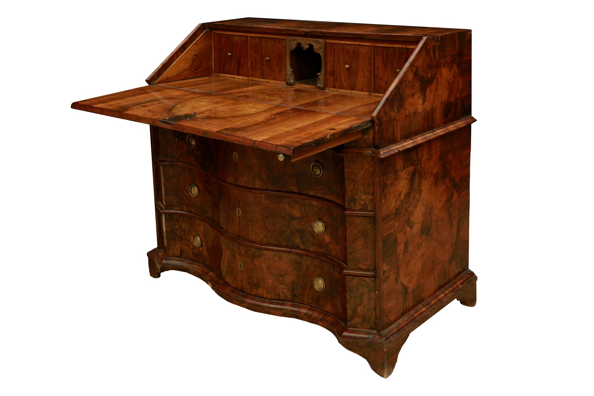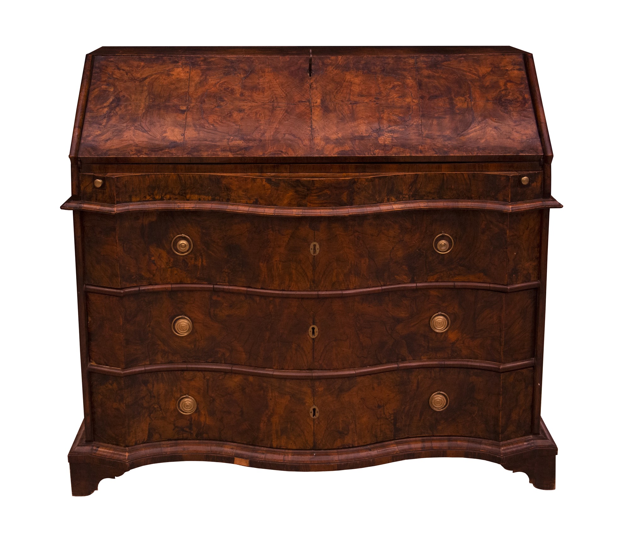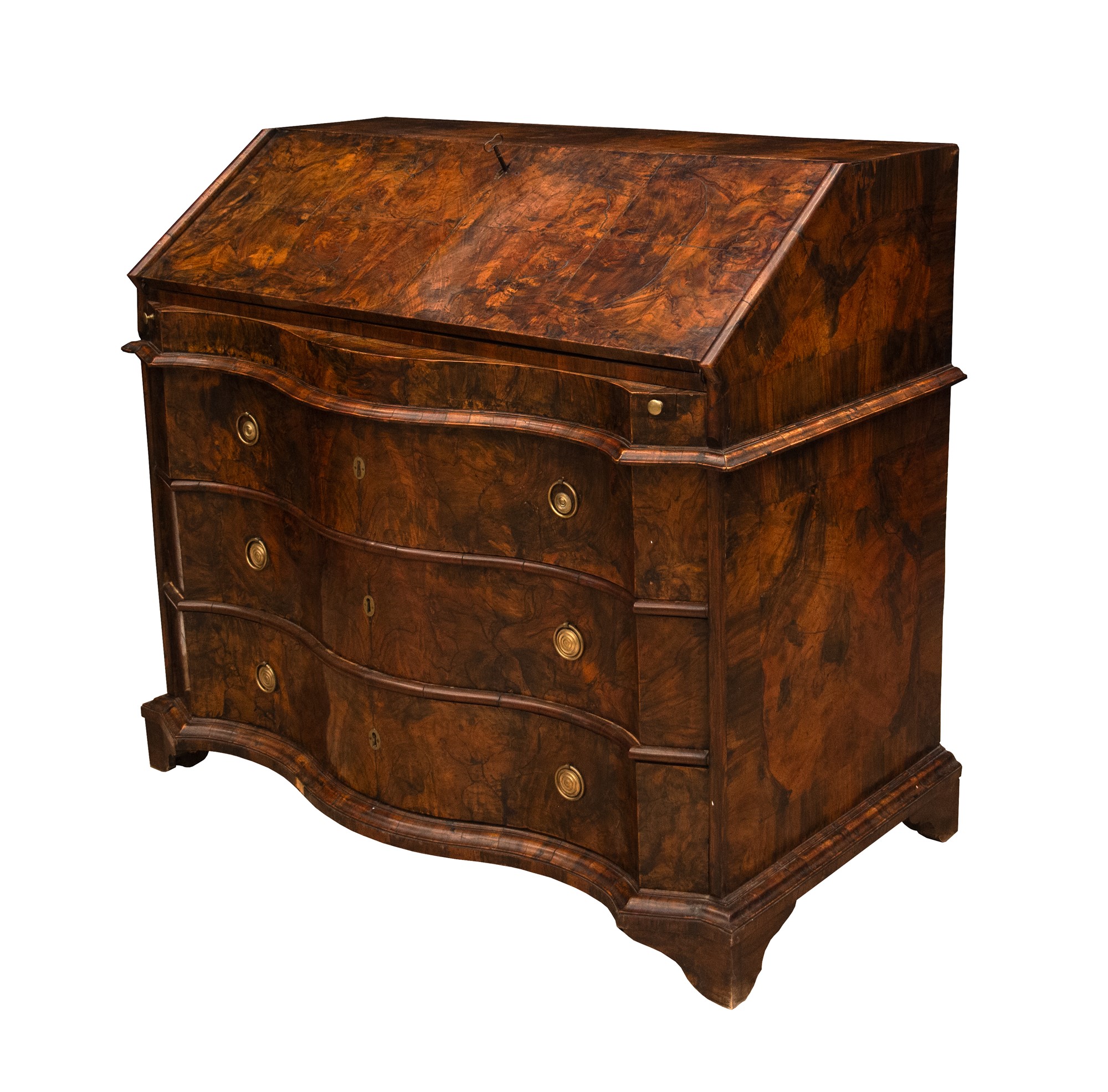 Splendida ribalta in radica di ulivo a fronte mosso a 3 cassetti con segreto sul piano scrittoio.