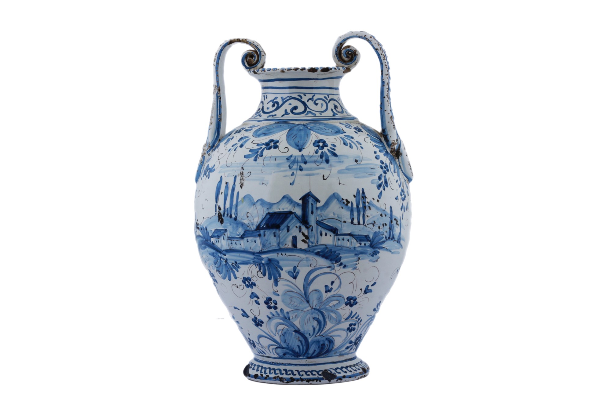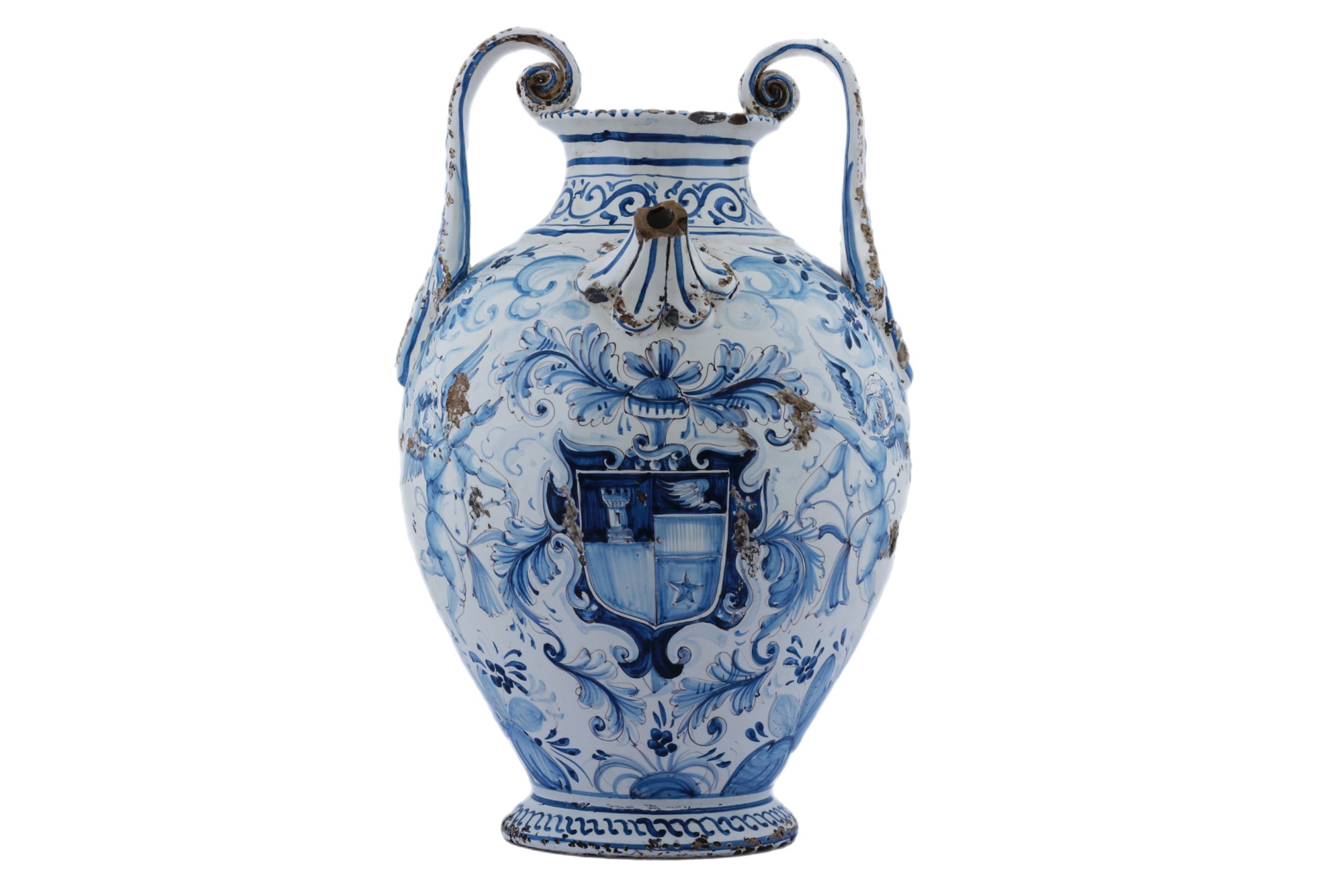 Grande orciolo biansato con decoro a smalto berettino. Manifattura napoletana del XVIII secolo