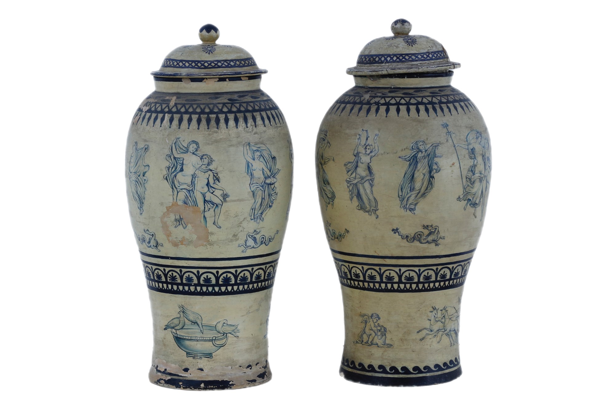Coppia di potiche con coperchio in maiolica bianca e blu con decorazioni di gusto mitologico XIX secolo