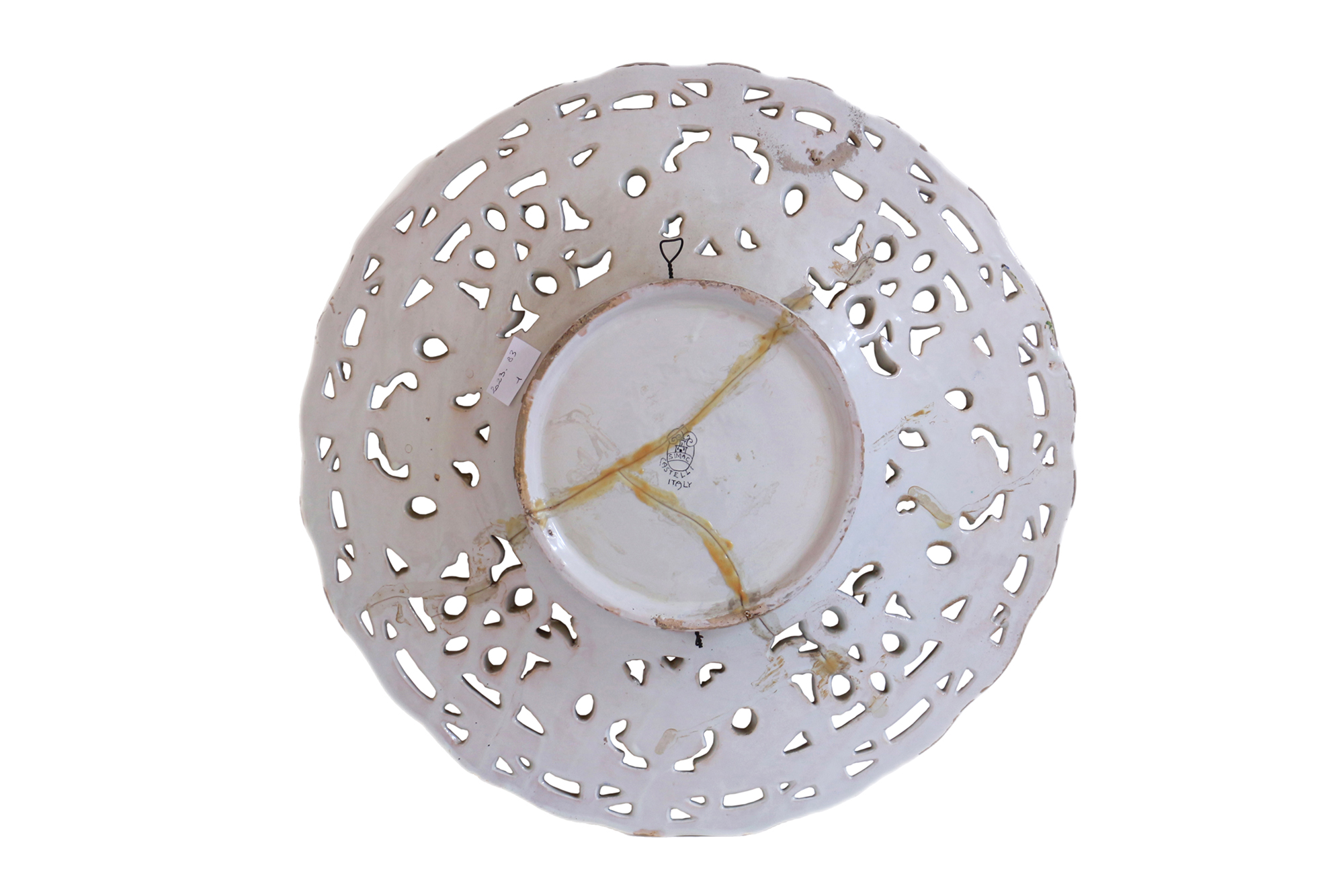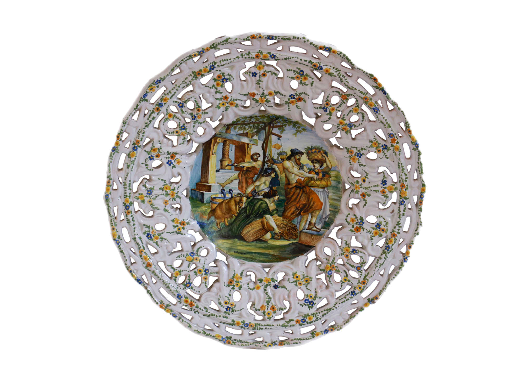 Grande piatto traforato realizzato per la Simac di Castelli con decoro floreale sulla tesa e scena agreste con raccolta del grano e torchiatura dell'uva