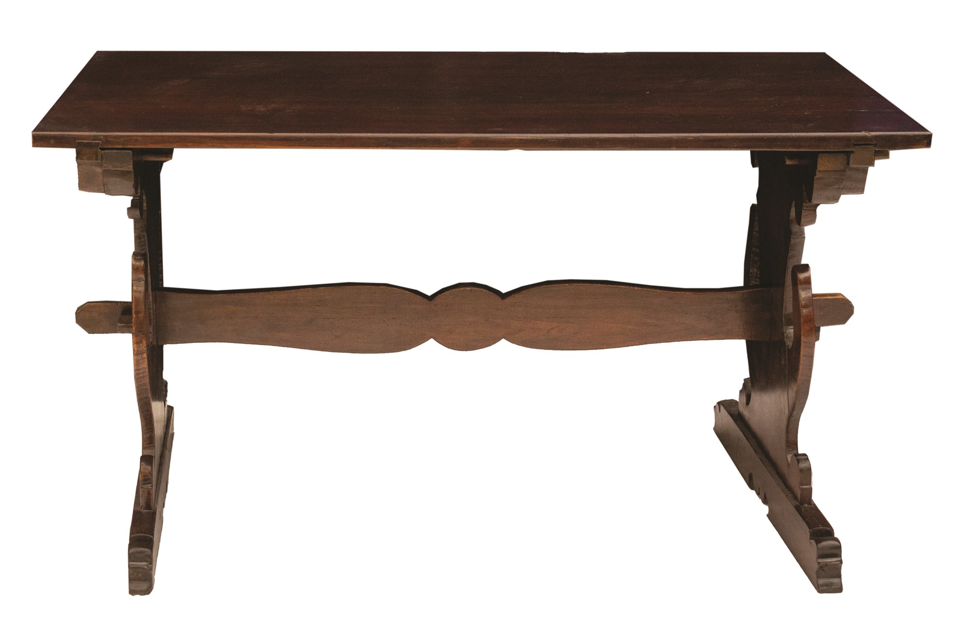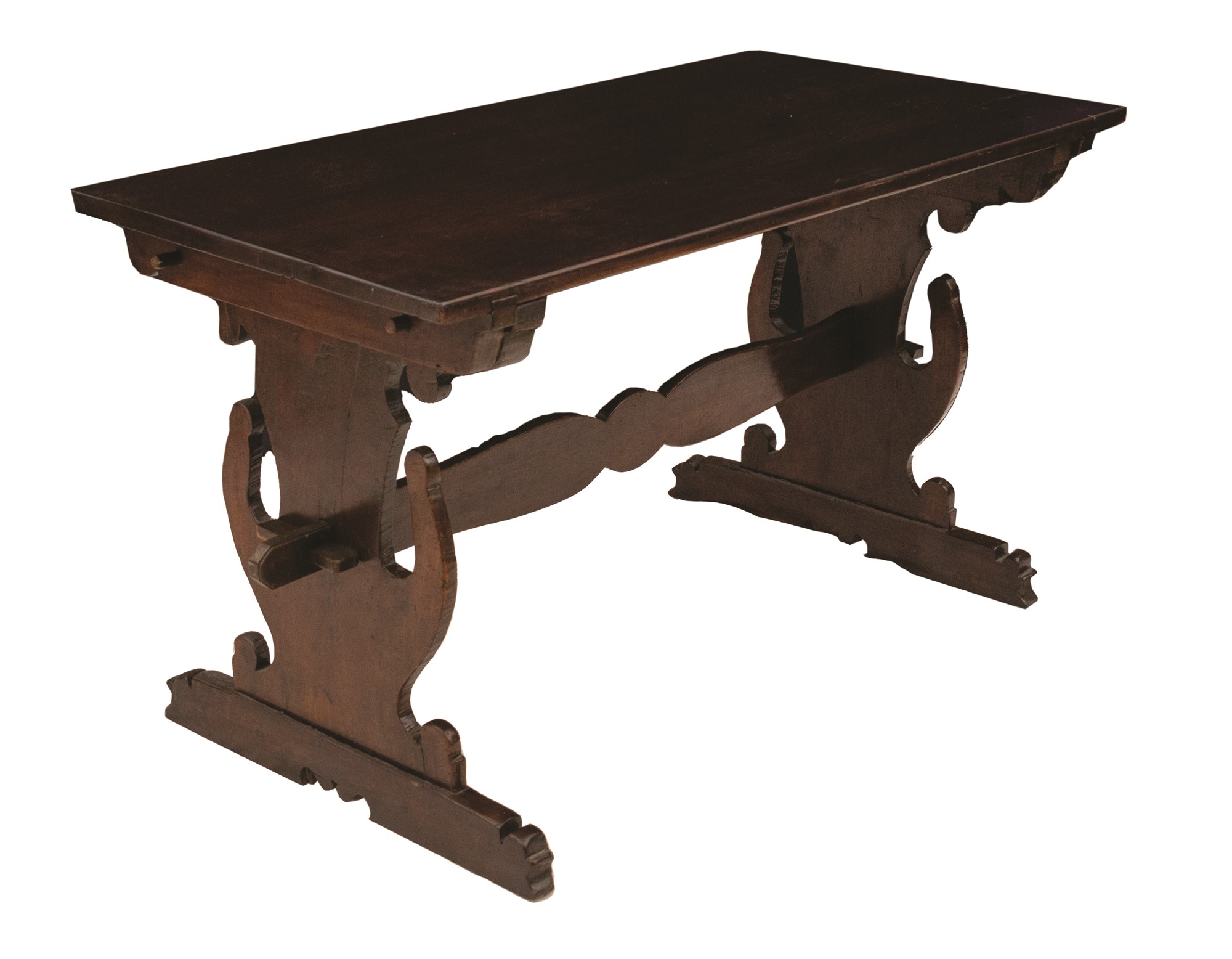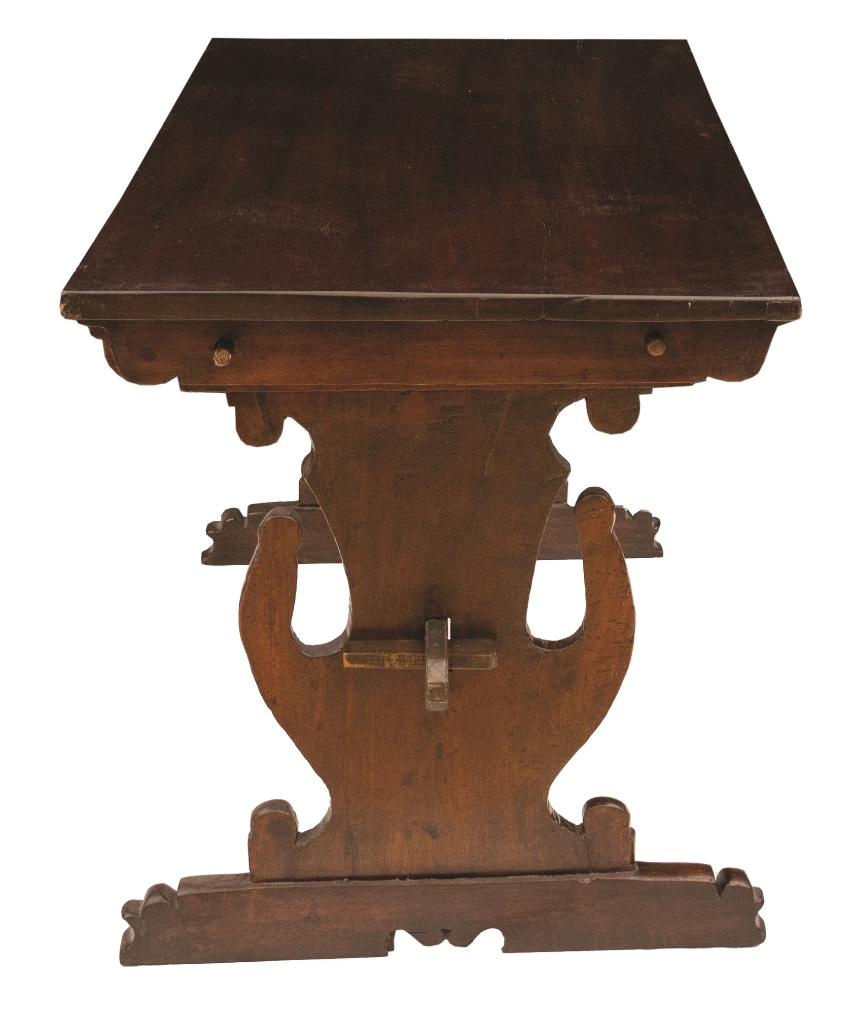 Tavolo scrittoio in noce con piano in asse unica. Piede sagomato ad asso di coppe. Centro Italia, prima metà del XVII secolo