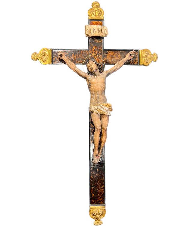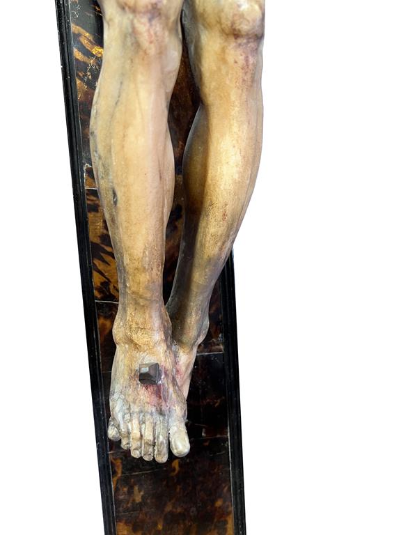 Al retro e nella parte bassa della croce targa in ottone con inciso "Crocifisso che stava nella Cappella di Monsignor Ugo Boncompagni Ludovisi e fu dato come ricordo di Lui alla Sorella Maddalena Religiosa del Sacro Cuore. Febbraio 1936".