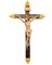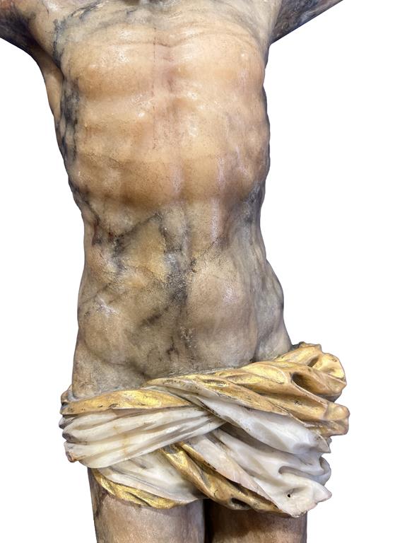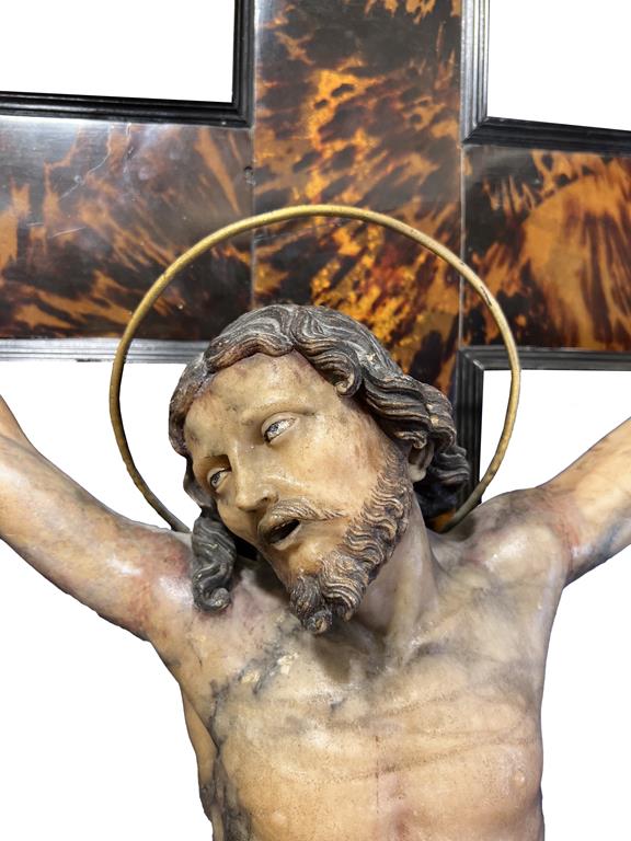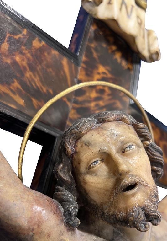 Antico crocifisso in alabastro rosa con cornici in ebano e canti in rame dorato. Cartiglio recante l'iscrizione I.N.R.I. in alabastro rosa.