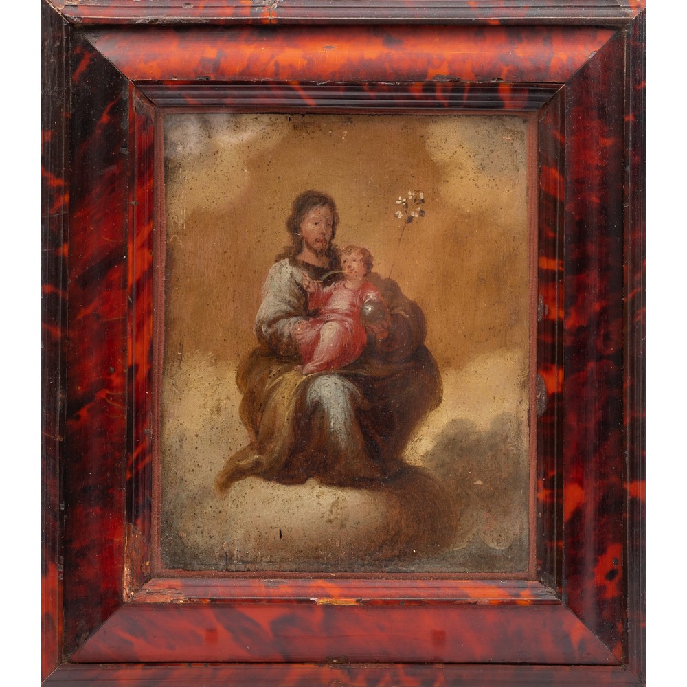 Olio su tavola raffigurante "San Giuseppe con bambinello" entro cornice in tartaruga coeva.