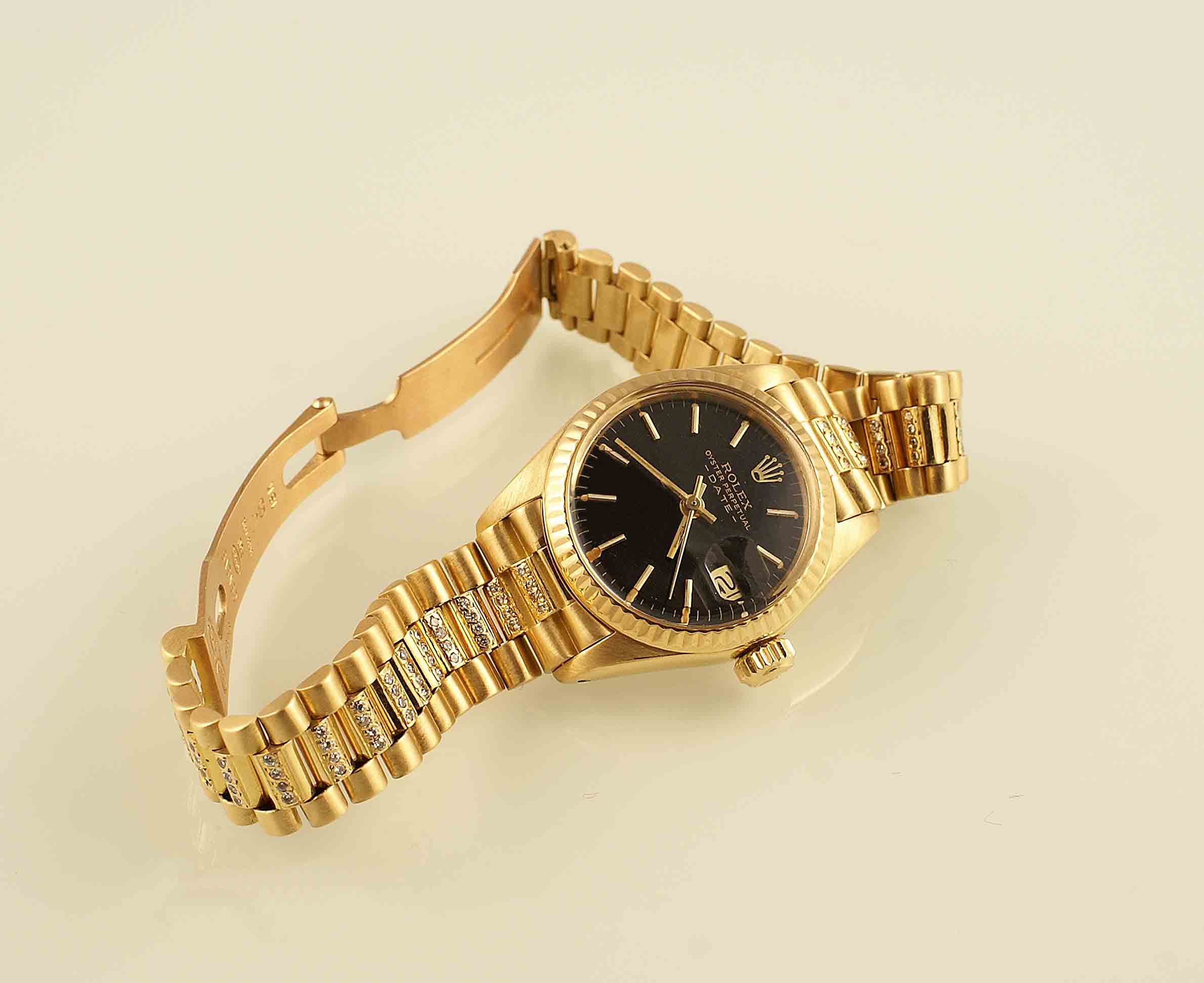 Orologio Rolex Lady Oyster Perpetual Date , in oro giallo 18kt, cassa tonda quadrante nero con indici dorati, datario ore 3, movimento meccanico a carica automatica, bracciale president in oro giallo con diamanti taglio brillante per carati 1,40 circa, anni 80, gr.68,6, custodia originale.