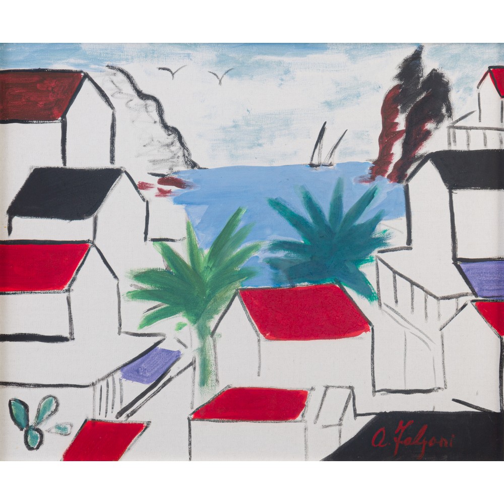 PITTORE DEL XX SECOLO, Case sul mare, Olio su tela