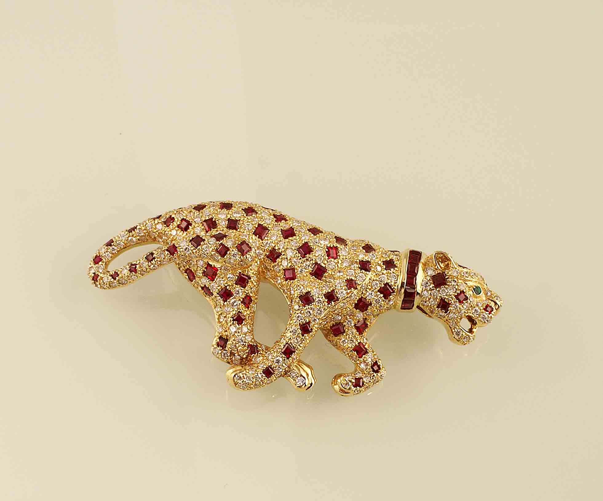Spilla pantera in oro giallo 18kt con incastonati diamanti taglio brillante per carati 4,70 circa e rubini carrè per carati 3,60 circa, occhi di smeraldi, gr. 31,7 accompagnata da certificato gemmologico.