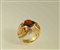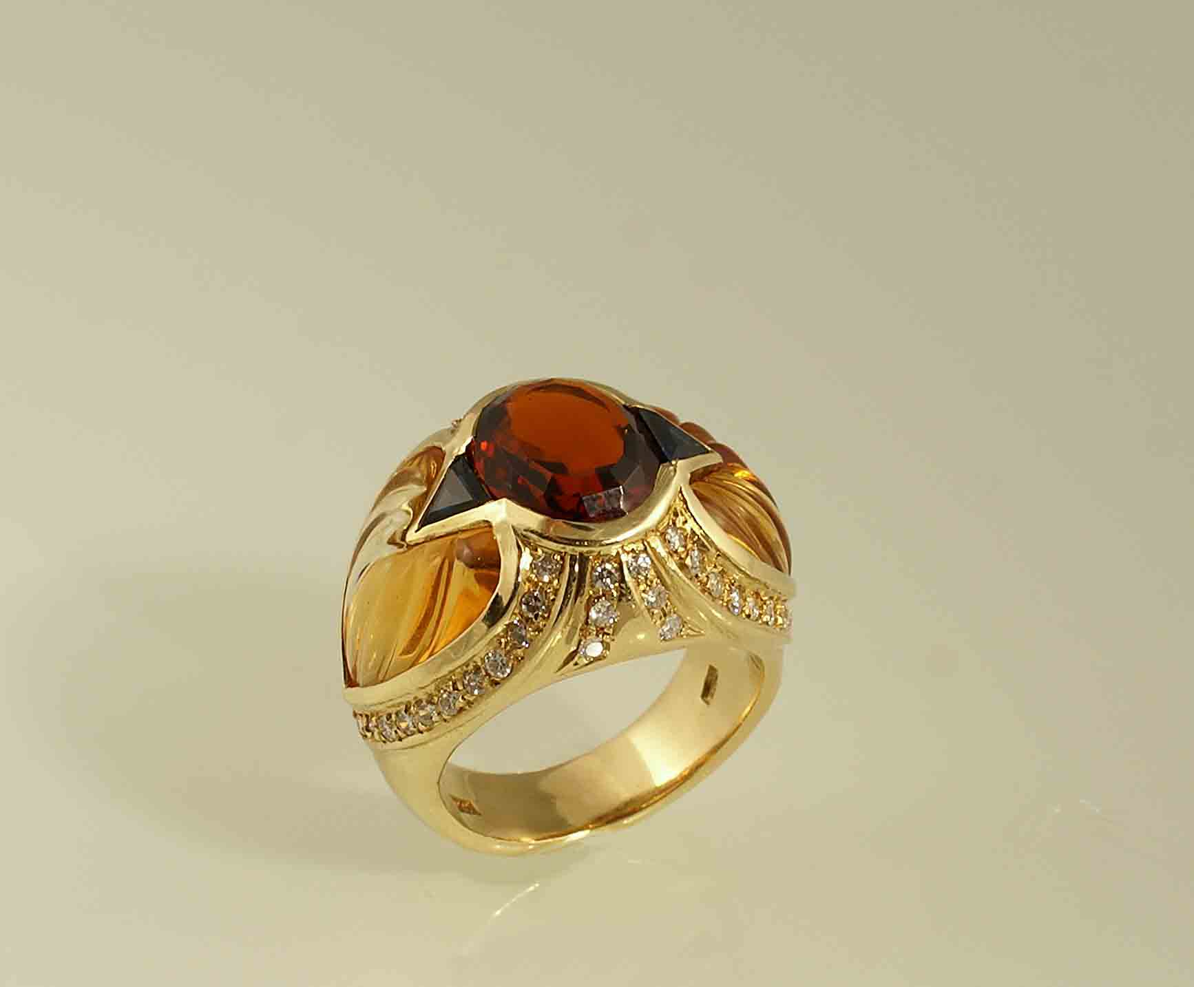 Anello in oro giallo 18kt con incastonato un topazio ovale, due zaffiri triangolari, due quarzi citrini incisi e diamanti taglio brillante per 0,90 punti circa, gr. 18.