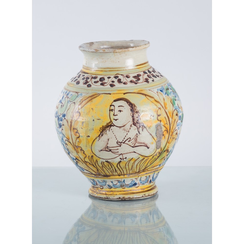 Boccia in maiolica policroma con decori a ramages e medaglione centrale con personaggio in preghiera (si evidenziano restauri al bordo superiore e un foro in prossimità della base)