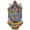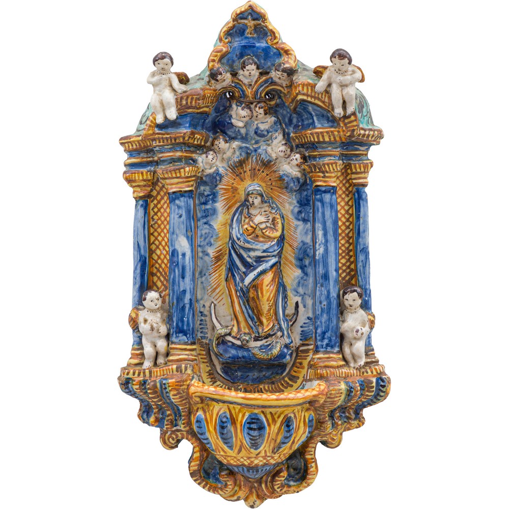 Acquasantiera in maiolica policroma con al centro la Vergine Maria tra gli angeli, nei toni del blu cobalto, giallo antimonio, verde ramina e marrone di manganese.