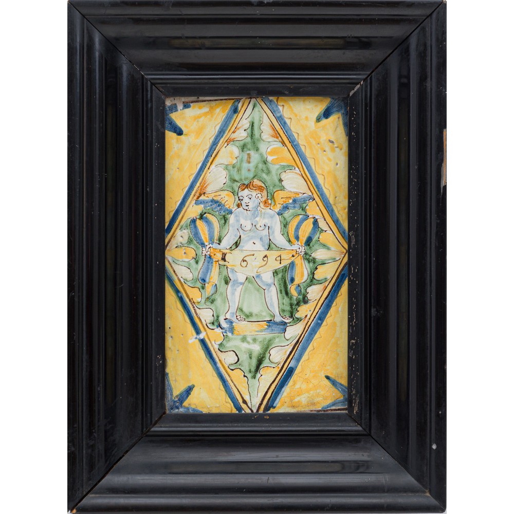 Mattonella in maiolica policroma con al centro medaglione a forma di rombo con Putto alato recante la data di produzione "1694".