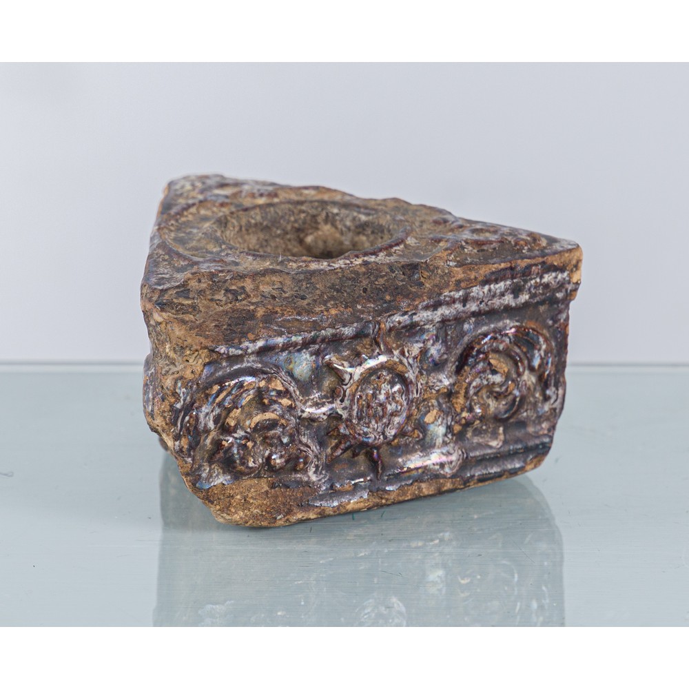 Calamaio in maiolica smaltata nei toni del marrone, di forma triangolare, con monogrammi IHS, in uso presso la Compagnia di Gesù.