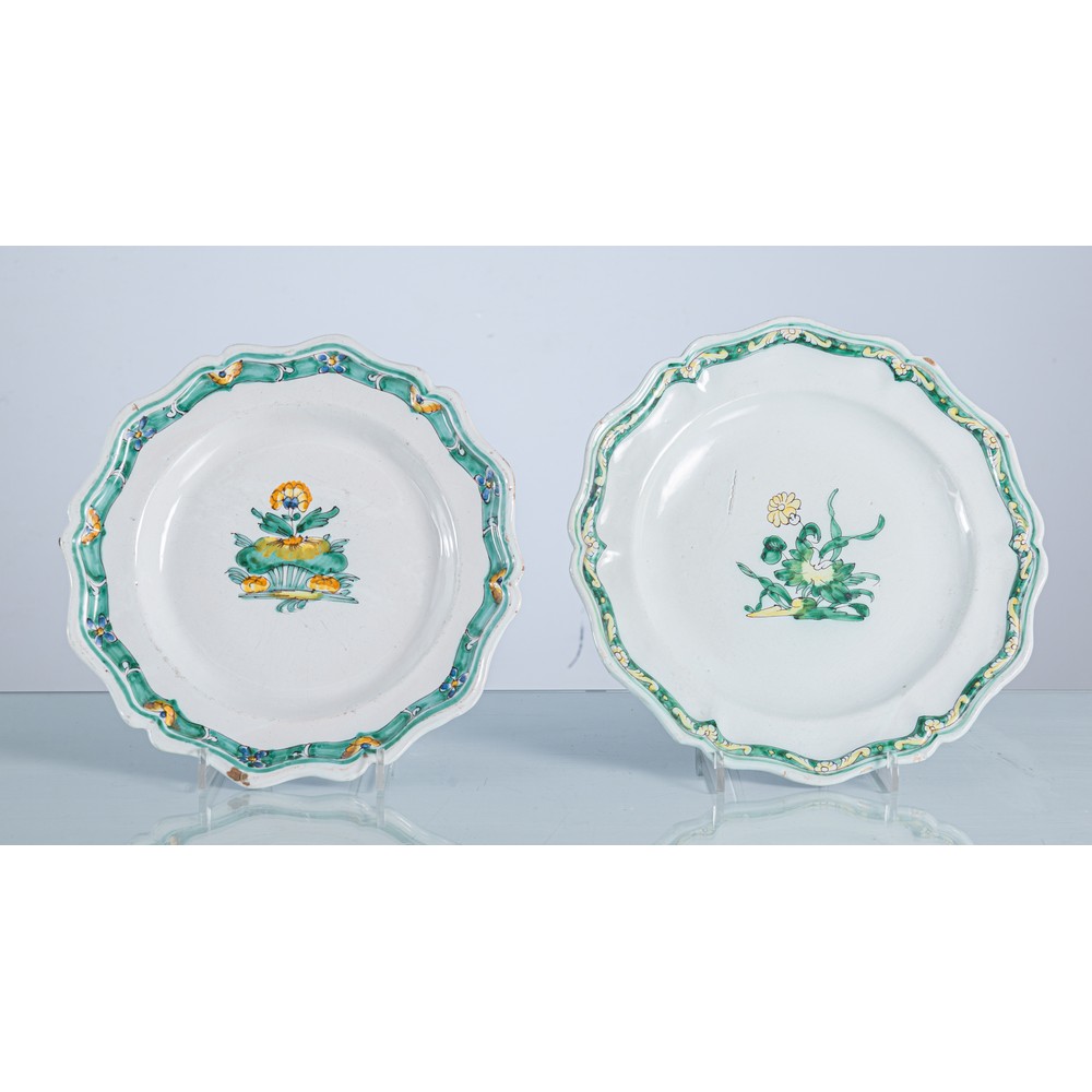 Coppia di piatti in maiolica decorata a motivi floreali nei toni del verde ramina e giallo antimonio