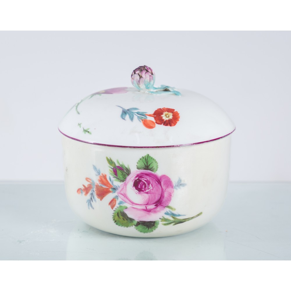 Zuccheriera in porcellana policroma decorata a motivi floreali. Marchio a pennello blu sotto la base (vecchi restauri alla coppa).