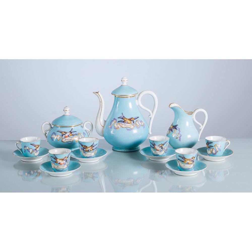 Servizio di caffè detto "del Cardellino" in porcellana dipinta a mano composto da caffettiera, lattiera, zuccheriera e da sei tazze con piattini.