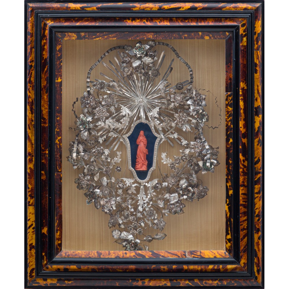 Importante composizione in argento lavorato a motivo floreale e fogliaceo con al centro scultura in corallo raffigurante "Madonna", entro teca in legno ebanizzato e laccato a finta tartaruga (mancanza).