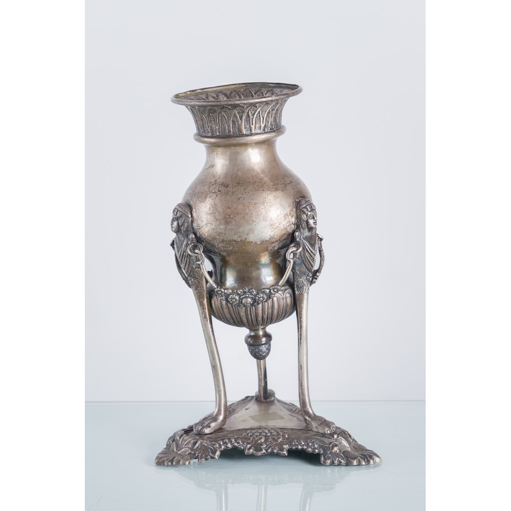 Bruciaprofumo Retour D'Egypte in argento cesellato e sbalzato, sorretto da tre figure di cariatidi.