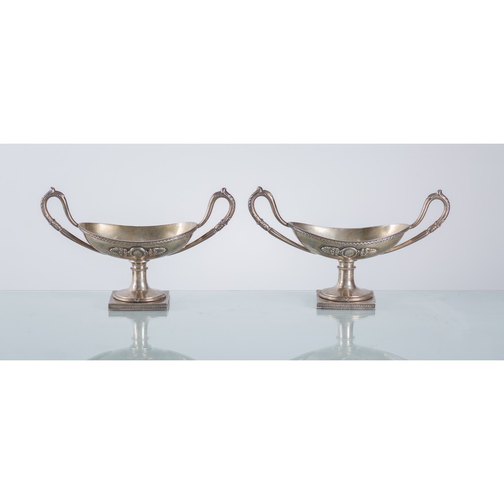 Coppia di alzate in argento cesellato e sbalzato, punzoni alla base e sopra il medaglione centrale della coppa